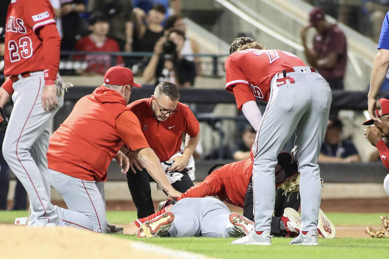 MLB美國職棒大聯盟昨日洛杉磯天使隊與紐約大都會一戰,在比賽地4局時出現了相當驚悚的「爆頭」一幕,讓現場所有球迷都嚇傻了眼!原因是在一壘手傳球傳向三壘試圖抓盜壘的跑者時,不慎將球砸到補位投手的頭部聲音相當響亮,投手當場倒地不起隨即退場送醫進行治療。