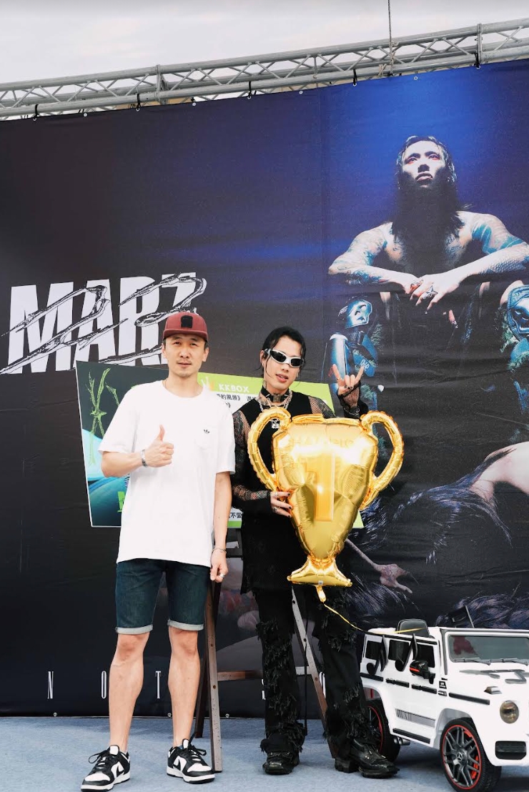 而前陣子《不遠處》世界巡迴演唱會甫告一段落,為感謝樂迷相挺,Marz23也特地選在今日舉辦簽唱會,希望面對面親自感謝每位歌迷,更大放送在現場演唱新歌!為慶祝專輯好成績,華納音樂也與Marz23一一揭開「戰果」,緊接著華納音樂的大家長-董事總經理楊國修更特別到現場,為Marz23送上了迷你版的「冠軍名車」並升起冠軍的漂浮氣球,這份禮物別具意義,除了恭喜Marz23成績優異並乘著名車前進北流,迷你的小車更特地送給成為「人父」的Marz23!Marz23笑說:「2023真的是很豐收的一年,先是第一次到這麼多海外城市跟『23部隊』見面,接著下半年還成為『人夫』及『人父』雙重身份;我也會收下這份好運的禮物攻下北流!」