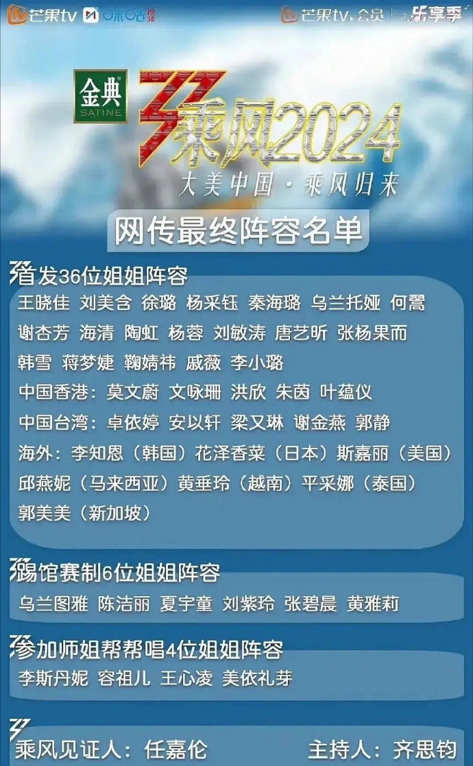 網路上流傳的《乘風2024》名單共包含36位首發選手,以及6位踢館者,4位回鍋幫唱的姐姐。其中來自台灣的選手共有5位,分別是卓依婷、安以軒、梁又琳、郭靜以及謝金燕,香港則有莫文蔚。然而最引人注意的是,海外選手有日本聲優「花澤香菜」,演出《初戀那件小事》而聲名大噪的泰國女星「平采娜」,甚至連南韓實力派歌手「IU」以及好萊塢巨星史嘉蕾・喬韓森都驚現名單中。