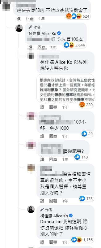 不僅如此,柯佳嬿過去發新書《再見少女》時,有網友「過度關心」,在她的貼文下方留言:「趕快去凍卵啦!不然以後就沒機會了。」由於當時正值新書《再見少女》剛發行,所以柯佳嬿先是和氣地說:「好,你先買100本」,沒想到該名網友又接著PO出關於高齡產婦的調查報導,讓她不忍回擊:「我知道啊!跟你沒關係吧?你幹嘛擔心別人的卵子?」獲得粉絲們的力挺。