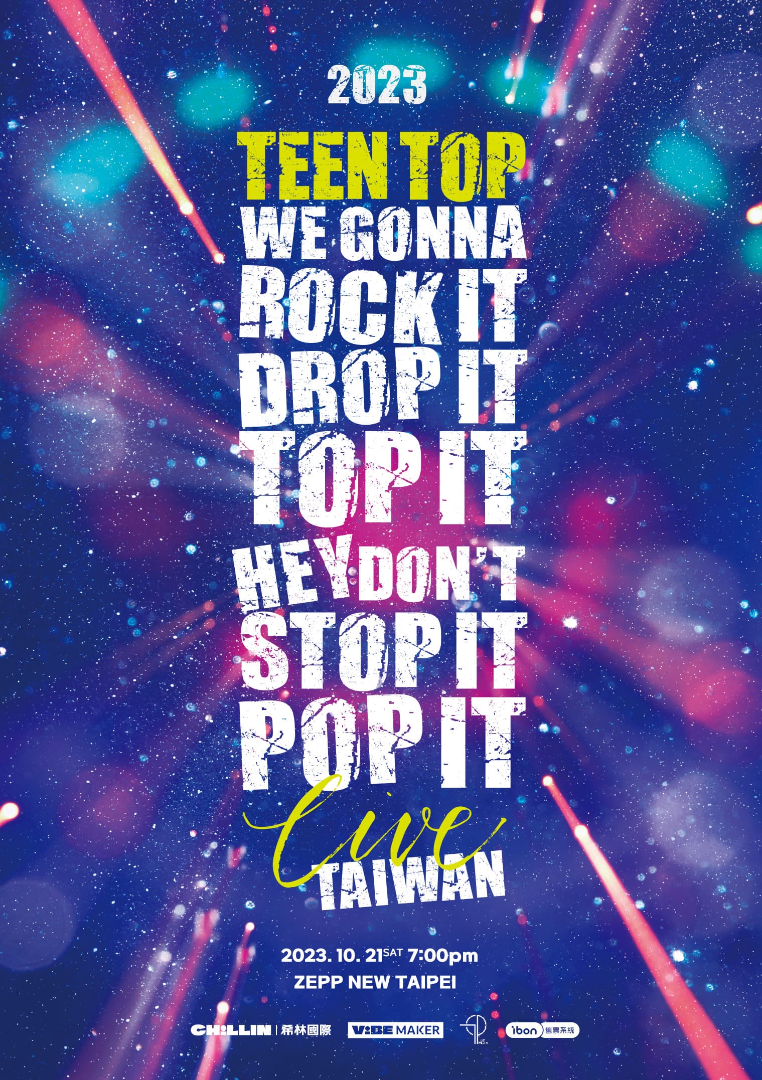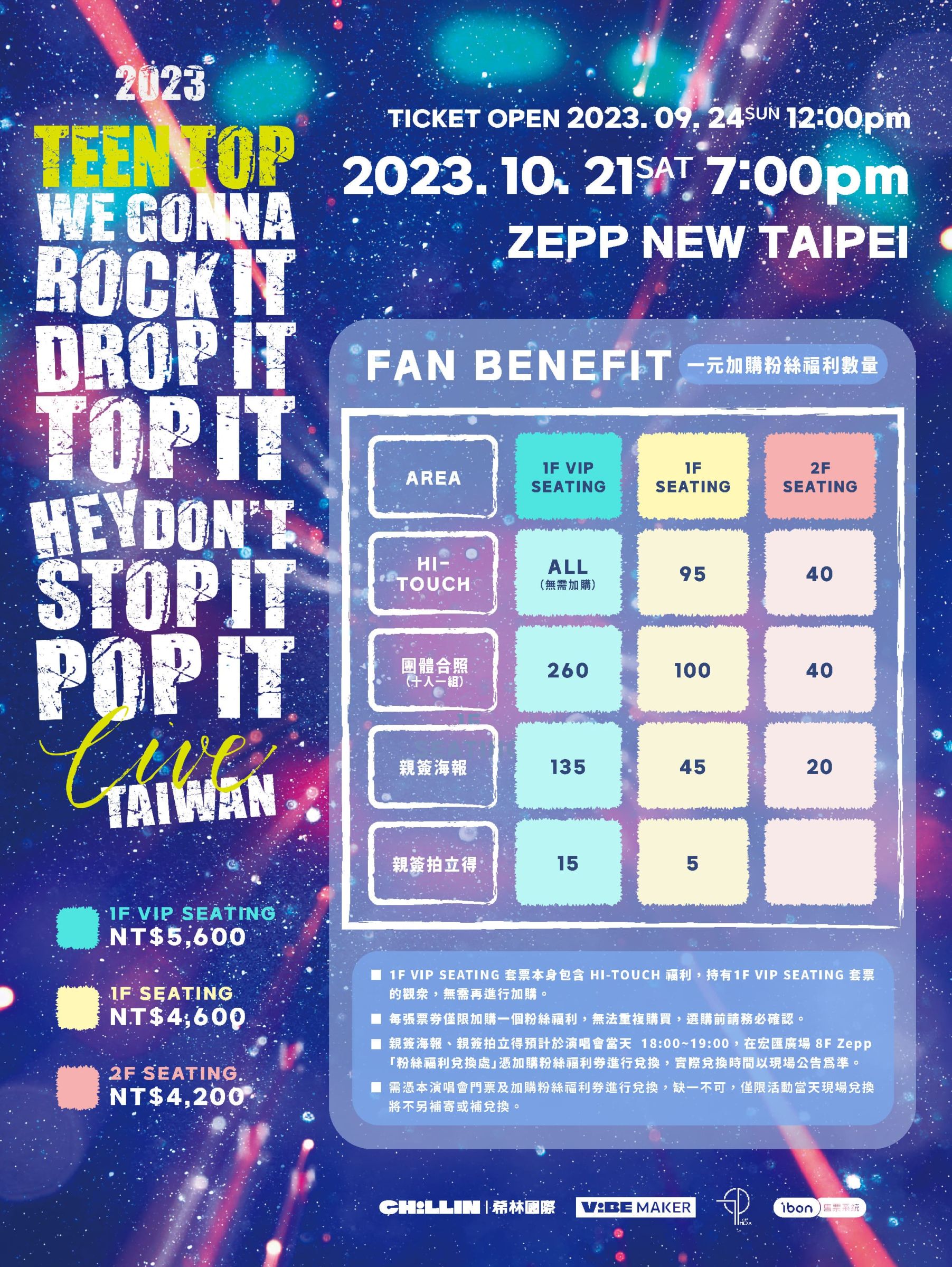TEEN TOP 將於 10 月 21 日(六)來台在 Zepp New Taipei 舉辦 「2023 TEEN TOP CONCERT IN TAIWAN “we gonna rock it drop it top it hey don't stop it pop it LIVE”」演唱會,演唱會門票將在 9 月 24 日中午 12 點在 ibon 售票網站及全台 7-11 ibon 機台開賣,演唱會票價為一樓座位區 NT$ 4,600 / 二樓座位區 NT$ 4,200,另將推出限量 VIP 套票組 NT$ 5,600 (含價值 NT$ 4,600 一樓座位票券乙張、一對一擊掌福利券乙張以及 VIP 專屬工作證、VIP 專屬掛繩),購票粉絲還有機會在 10 月 7 日可使用一元加購合照(十人一組)、親筆簽名海報、親筆簽名拍立得等,TEEN TOP 除了將帶來多首經典歌曲,也將帶來今年發行的新歌舞台,粉絲們務必把握這次的演唱會。