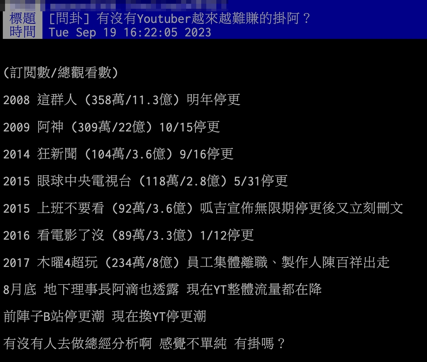 有網友在PTT以「有沒有Youtuber越來越難賺的掛阿?」發起討論,並詳細列出近期宣布停更頻道的成立年份、訂閱數及總觀看數,像是這群人於2009年創立,有358萬訂閱,收看次數高達11.3億;阿神於2009年創立,有309萬訂閱,22億觀看次數;眼球中央電視台於2015年創立,有118萬訂閱,2.8億觀看次數等,總共有5個平台。另外還包含呱吉曾宣布無限期停止更新又刪除文章,以及《木曜4超玩》的離職潮。