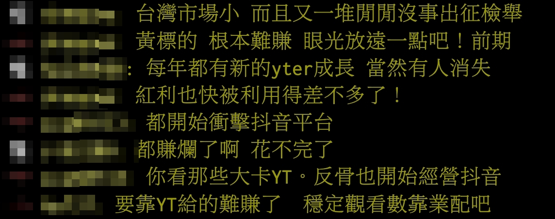原PO表示:「阿滴也透露現在YT整體流量都在降,前陣子B站(中國影音平台)停更潮,現在換YT停更潮」,感覺案情不單純,因此好奇大家的看法。對此,大家紛紛提出想法,「飽和又高更新,題材又差不多」、「所以一定要經營其它商業活動啊」、「台灣的餅就這麼大,一堆新YTR搶著吃」。