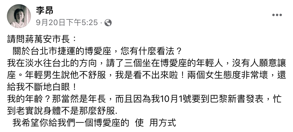 博愛座爭議的起因,正是李昂20日在臉書向蔣萬安市長喊話,透露搭捷運身體不舒服,因此詢問各別坐在博愛座上3位年輕人是否能讓座,其中一位年輕男生聲稱不舒服,但李昂表示:「我是看不出來啦!兩個女生態度非常壞,還給我不斷地白眼!」隨著討論越演越烈,她21日再度發文解釋,透露第一個年輕男生戴著耳機聽音樂,而且露出非常享受的表情,聽到要讓位的時候,才說不舒服,女生則是態度很差,讓她氣到血壓飆升,還因此遲到。