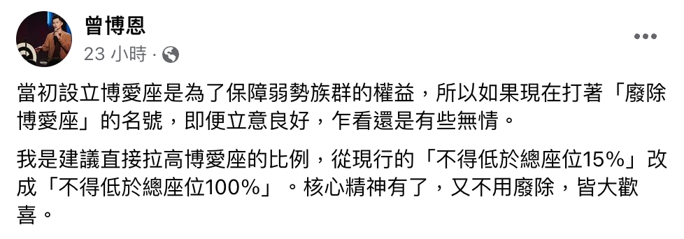 博恩認為博愛座設立的初衷是要保障弱勢族群的權益,「所以如果現在打著『廢除博愛座』的名號,即便立意良好,乍看還是有些無情。」他因此建議拉高博愛座的比例,從原本的「不得低於總座位15%」改成「不得低於總座位100%」,大讚:「核心精神有了,又不用廢除,皆大歡喜。」