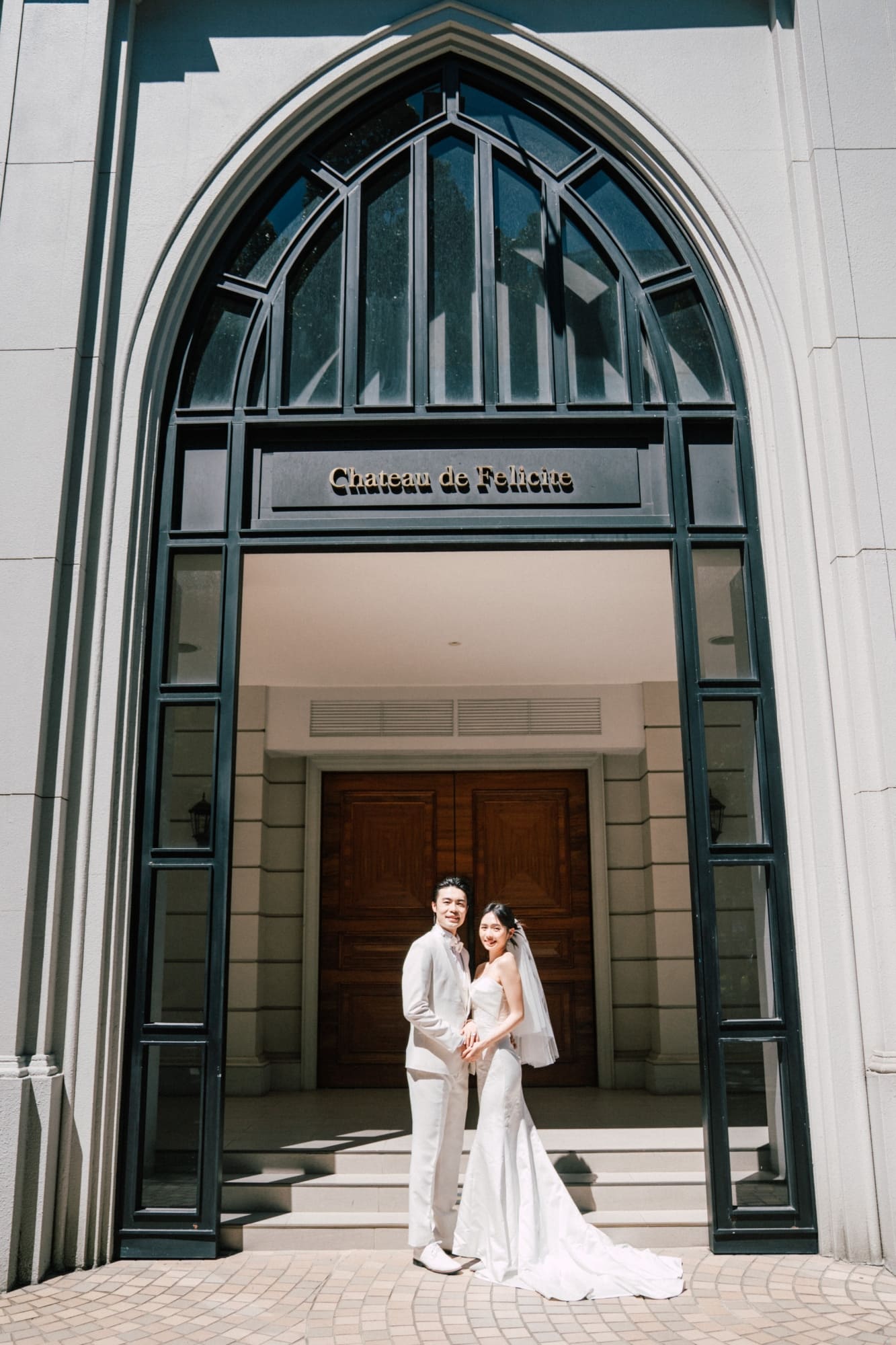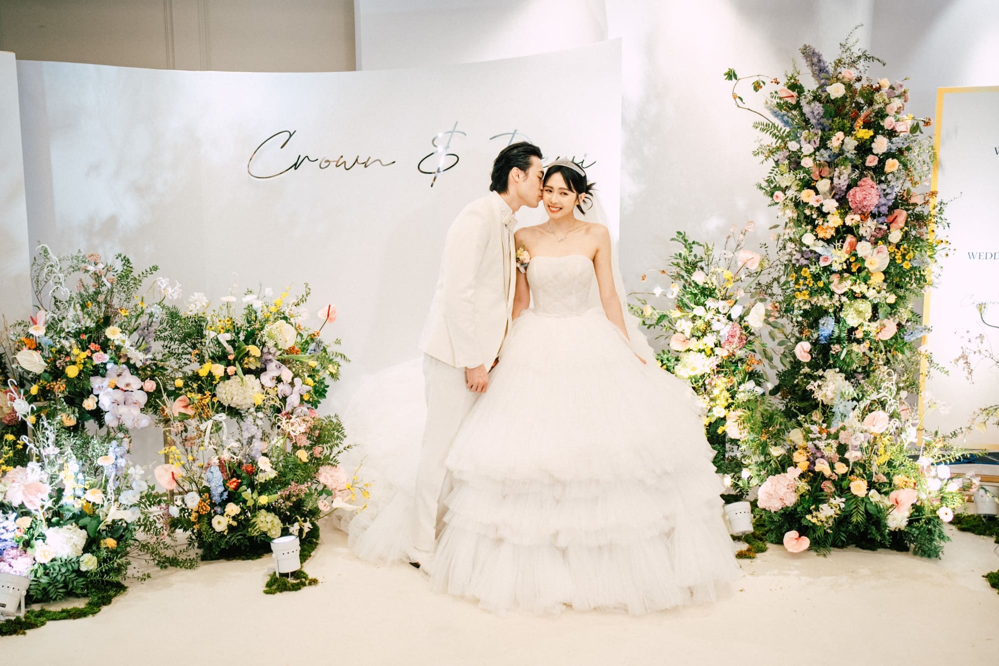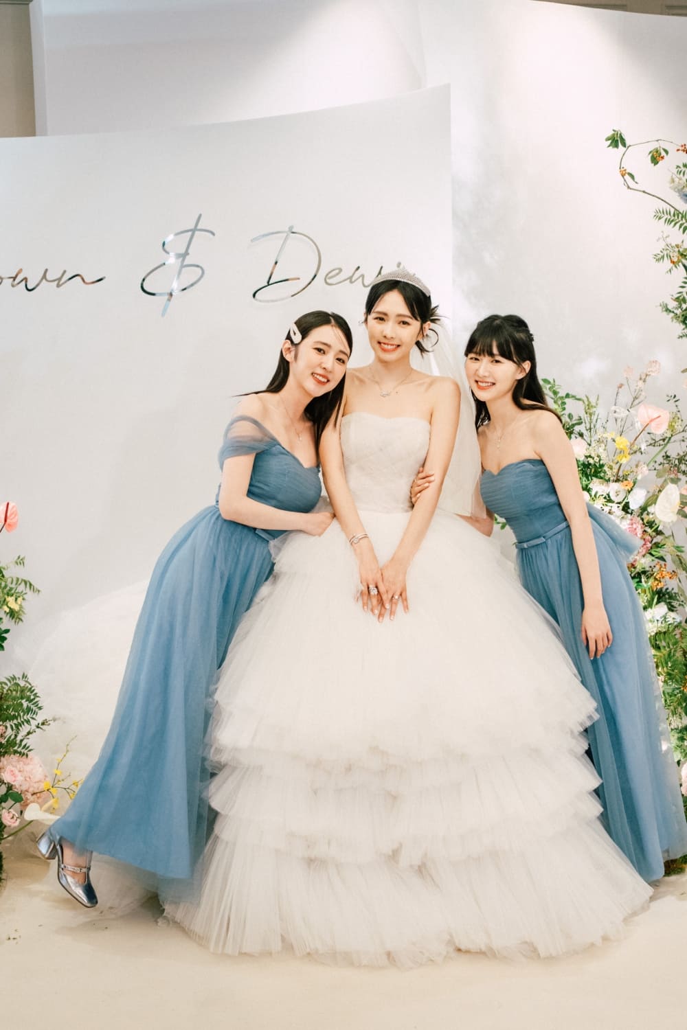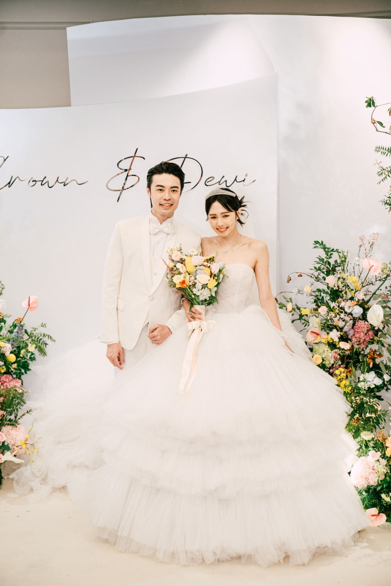 簡廷芮今早先進行教堂證婚儀式,隨即在翡麗詩莊園席開30桌展開午宴。她前後連換4套「韓國藝匠Artiz Studio」代理的Grace Kelly婚紗,配戴BVLGARI珠寶首飾,腳踩Christian Louboutin高跟鞋,每一次出場都讓賓客眼睛為之一亮,且特別準備她自己籌備很久的新品牌Mummum有機米餅作為伴手禮,預計下週正式對外販售。