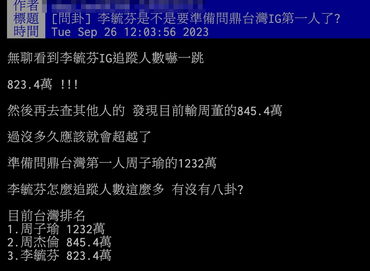 對此,原PO好奇表示:「李毓芬怎麼追蹤人數這麼多,有沒有八卦?」網友紛紛吐槽:「有什麼代表作?」、「她有這麼紅嗎?怎麼完全沒感覺」、「那個數字詭異到好不可思議」、「某方面來說也很厲害」。不過,依然有許人質疑李毓芬經紀公司買粉又買榜,這波操作反而會害了她。