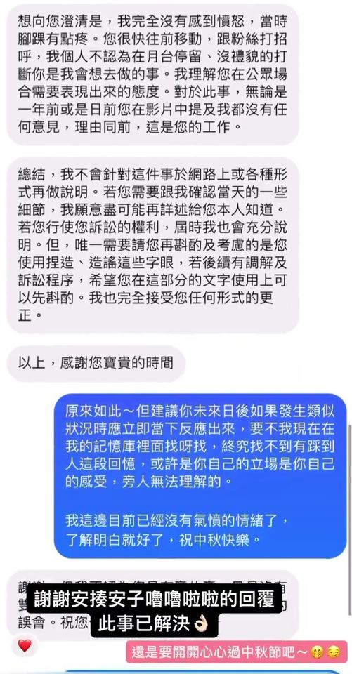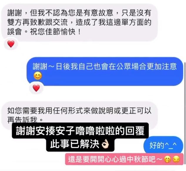 對此,鍾明軒建議對方日後如果發生類似的事情,應該要立即反應,並表示:「目前已經沒有氣憤的情緒了,了解明白就好了」,還不忘祝福中秋愉快。最後,原PO表明理解鍾明軒的立場,也不認為他是故意為之,只是雙方沒有溝通清楚而導致誤會,鍾明軒也承諾「日後我自己也會在公眾場合更加注意」。