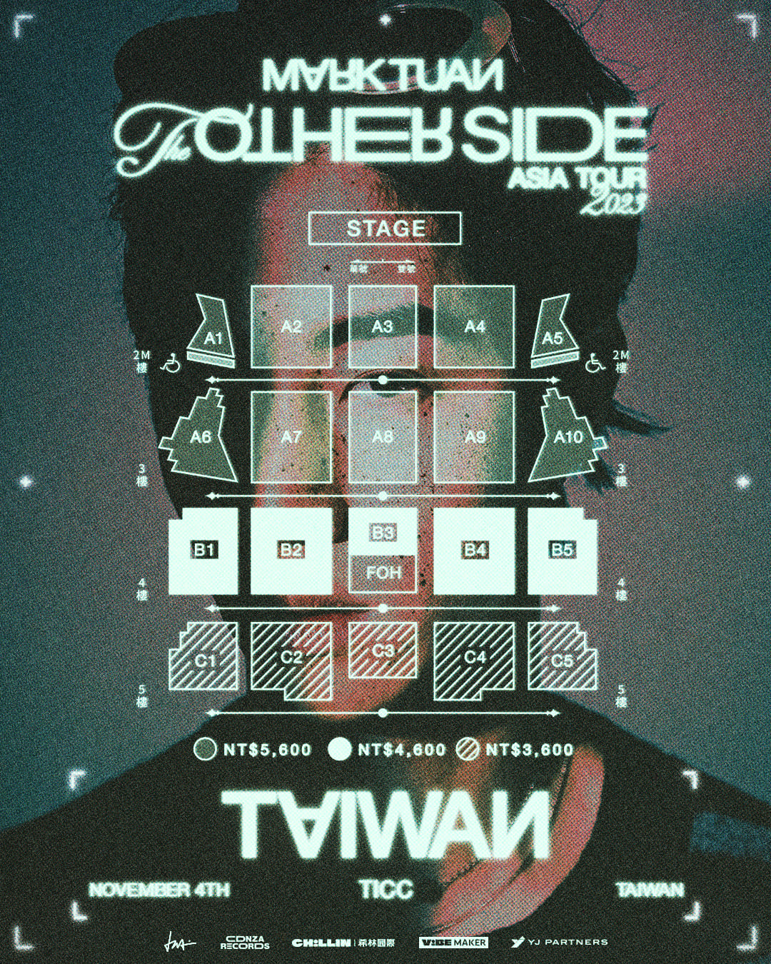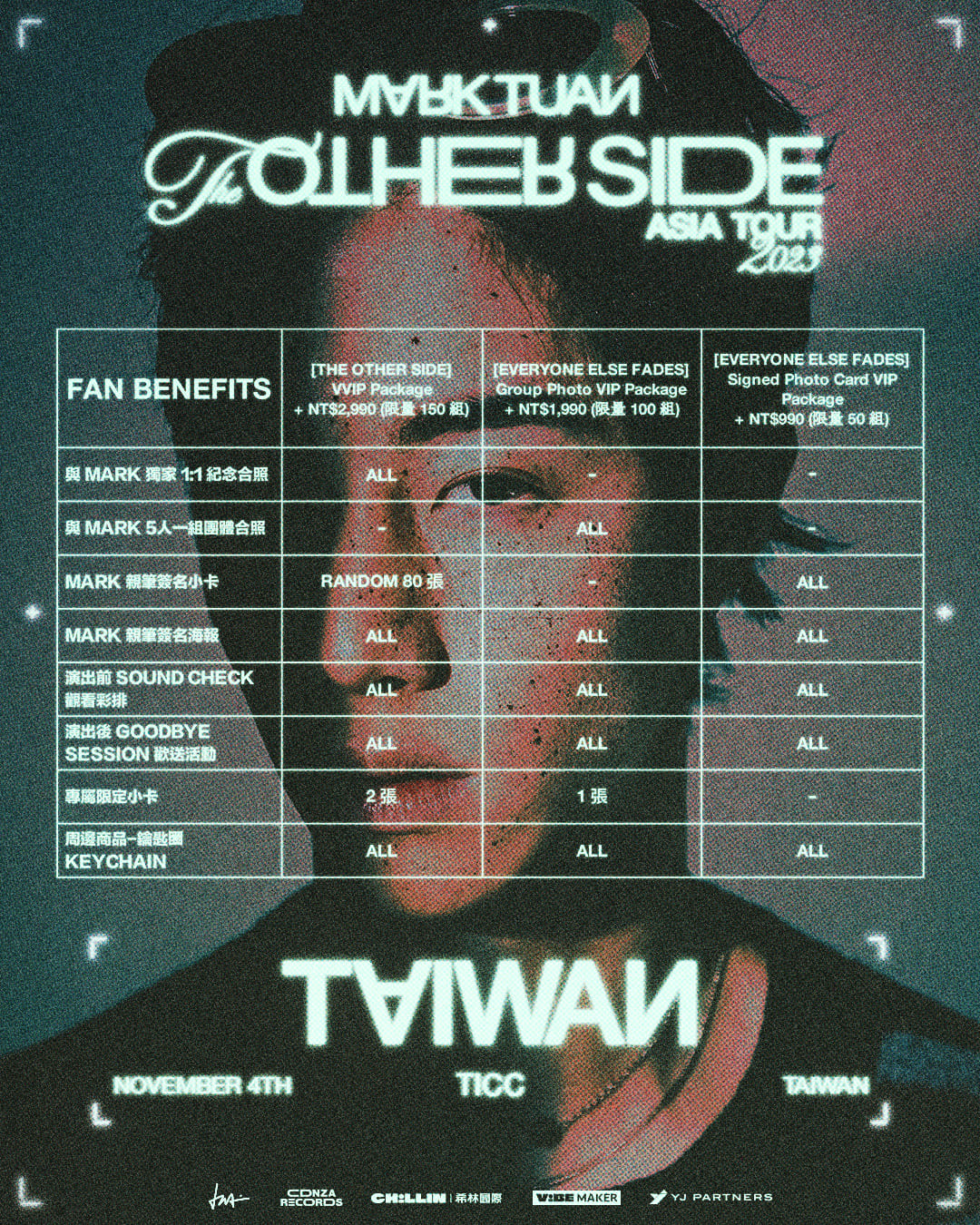 韓國 「GOT7」成員 MARK 將於11月4日(六)在 TICC 台北國際會議中心舉辦「 MARK TUAN 'The Other Side' ASIA TOUR IN TAIWAN 2023 」演唱會,時隔四年且首次以個人身分來台舉辦演唱會,演唱會門票將在 10 月 7 日(六)下午 1 點在 ibon 售票網站及全台 7-11 ibon 機台開賣,票價為 NT$ 5,600 / NT$ 4,600 / NT$ 3,600 ,這次特別推出