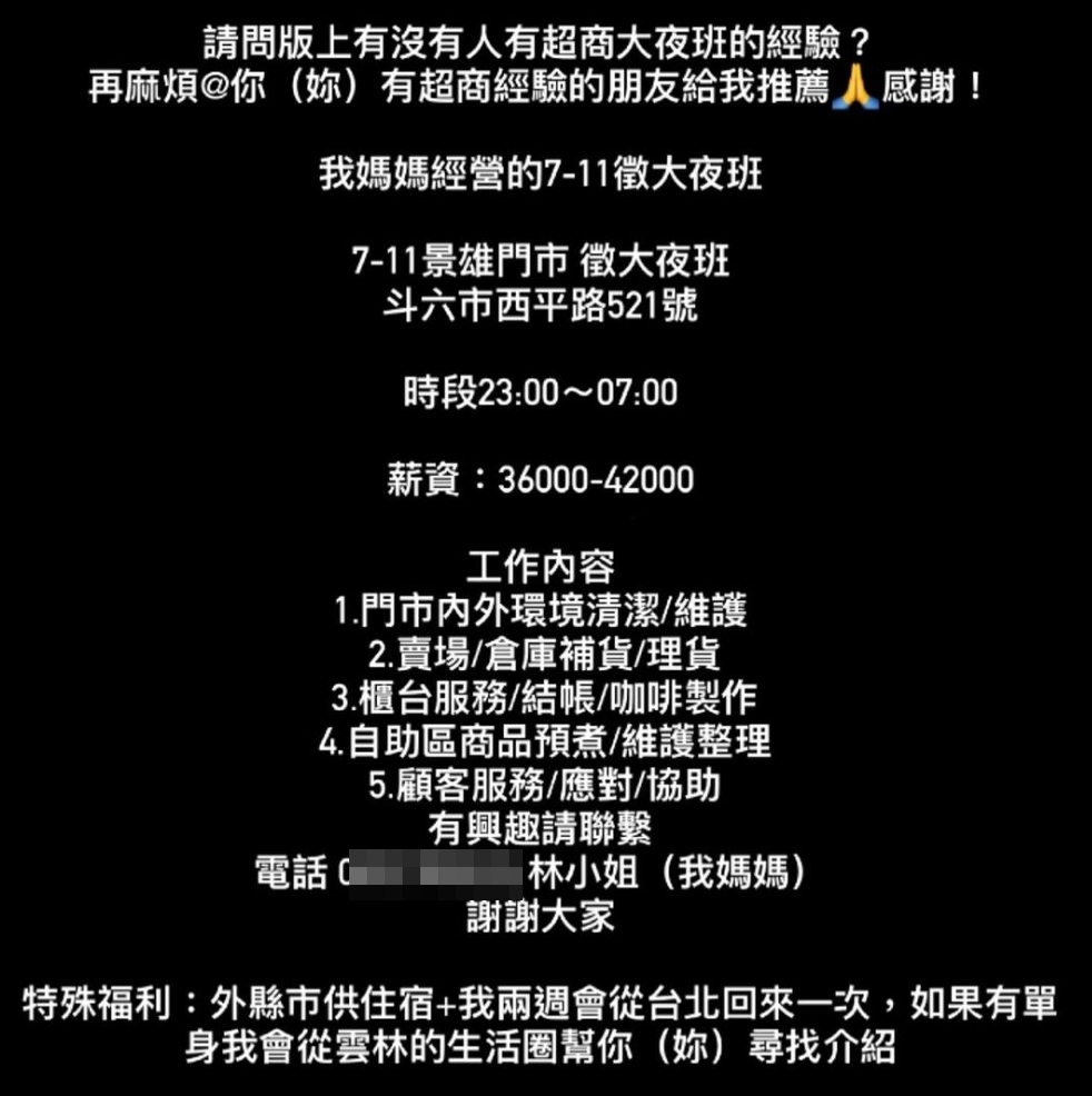 黑男2日在IG分享徵人資訊,透露媽媽在雲林經營的超商正在徵求有經驗的大夜班的員工,資薪開出3萬6千元至4萬2千元,工作內容包含門市內外環境清潔維護;賣場倉庫補貨理貨;櫃檯服務結帳、咖啡製作;自助區商品預煮維護整理;顧客服務應對協助。