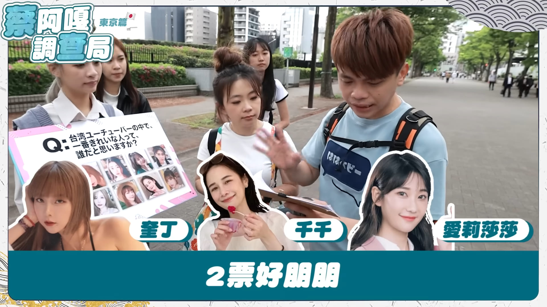 事實上,蔡阿嘎曾在日本街頭做民調,讓路人看照片選出心目中最漂亮的女YouTuber,人選分別有二伯、滴妹、奎丁、貝莉莓、白癡公主、愛莉莎莎、瑀熙、泱泱、千千和阿圓,然而千千僅獲得兩票,成為倒數第二名,前三名則是4票的阿圓和貝莉莓、5票的泱泱跟瑀熙。