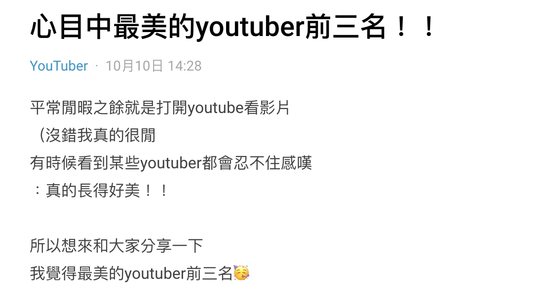 YouTuber除了製作出吸引人的影片會備受關注之外,亮眼的外型也是大家討論的話題之一,高顏值的創作者總是能成為網友心目中男神、女神。日前就有網友在網路上發起討論,分享心目中「最美的YouTuber前三名」,大家紛紛秀出私藏名單,掀起討論。