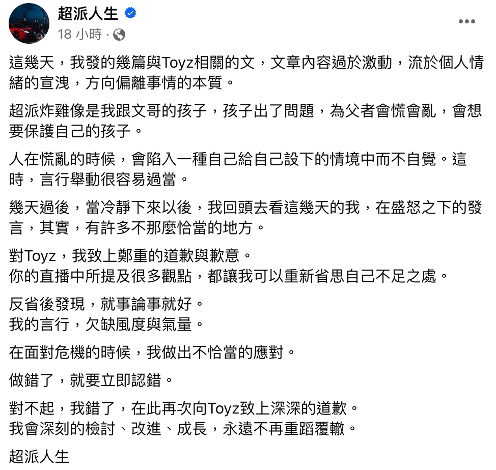 超哥12日發文坦言:「這幾天,我發的幾篇與Toyz相關的文,文章內容過於激動,流於個人情緒的宣洩,方向偏離事情的本質。」因為炸雞店就像自己的孩子,當知道出問題時,就會慌亂、會想要好好保護孩子。他坦言冷靜過後才發現,生氣時所說出的言論有很多不恰當的地方。