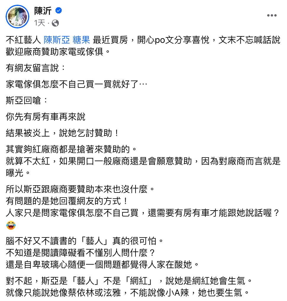 藝人詩亞近日跟網友分享買新房的喜悅,並在文末表示:「歡迎廠商們洽談贊助家電或是家具」,怎料此舉遭到批評,她還因此跟網友槓上。對此,網紅陳沂表示:「腦不好又不讀書的『藝人』真的很可怕。」詩亞則是火大回擊,兩人吵得不可開交。