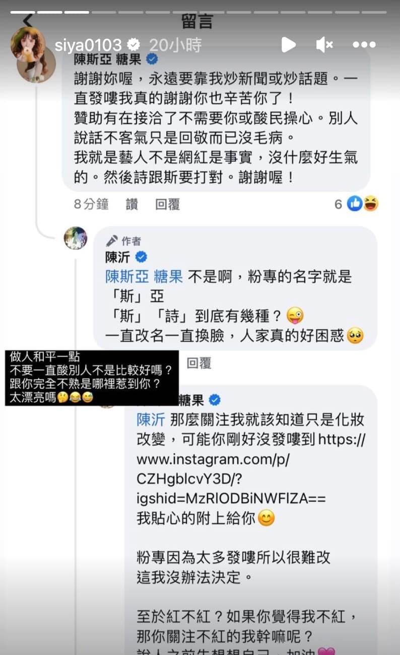 對此,詩亞不忍回擊:「謝謝妳喔,永遠要靠我炒新聞或炒話題。一直發嘍我真的謝謝你也辛苦你了!」她認為網友講話不客氣,自己只是以牙還牙,還要求陳沂要把自己的名字打對。陳沂則諷刺表示:「不是啊,粉專的名字就是「斯」亞,一直改名一直換臉,人家真的好困惑。」