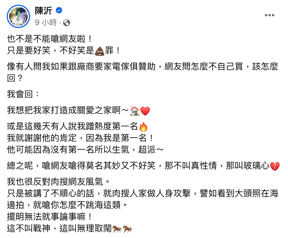 不僅如此,詩亞事後還將留言截圖放到IG限時動態,她表示做人要和平一點,不要到處酸人,更霸氣回擊:「跟你完全不熟是哪裡惹到你?太漂亮嗎?」陳沂13日凌晨再度回覆,她表示可以回擊網友,但是要以幽默的方式,「嗆網友嗆得莫名其妙又不好笑,那不叫真性情,那叫玻璃心。」