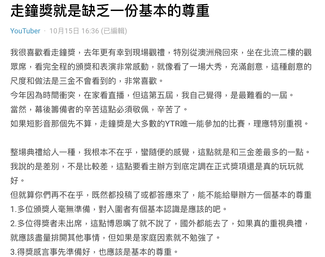 網友表示自己很喜歡看走鐘獎,去年還特地從澳洲飛回台灣觀禮,「看完全程的頒獎和表演非常感動,就像看了一場大秀,充滿創意,這種創意的尺度和做法是三金不會看到的,非常喜歡。」但是今年看完之後卻覺得「是最難看的一屆。」原PO認為走鐘獎是多數YouTuber唯一能參加的典禮,理應要特別重視,但是他直言:「整場典禮給人一種,我根本不在乎,蠻隨便的感覺。」、「就算你們再不在乎,既然都投稿了或都答應來了,能不能給舉辦方一個基本的尊重。」