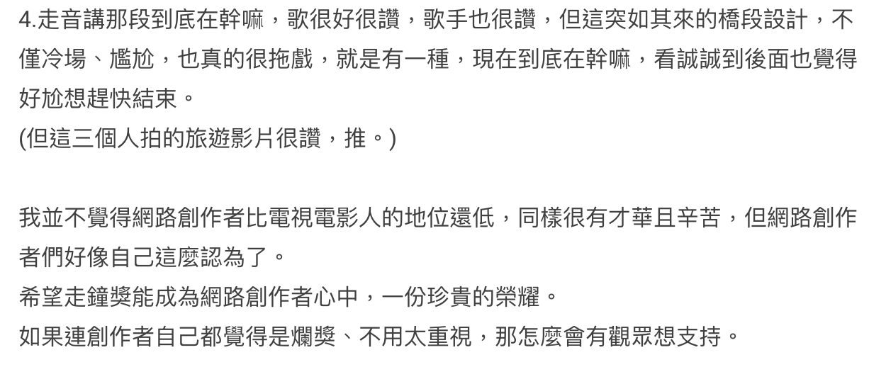 原PO指出多位頒獎人毫無準備,應該要對入圍者有基本認識;還有許多得獎者為出席,他表示:「國外都能去了,如果真的重視典禮,就應該盡量排開其他事情,但如果是家庭因素就不勉強了。」其他還包含「得獎感言事先準備好」、「橋段設計很尷尬」。原PO認為創作者的地位不底電視、電影人還低,「希望走鐘獎能成為網路創作者心中,一份珍貴的榮耀。如果連創作者自己都覺得是爛獎、不用太重視,那怎麼會有觀眾想支持。」