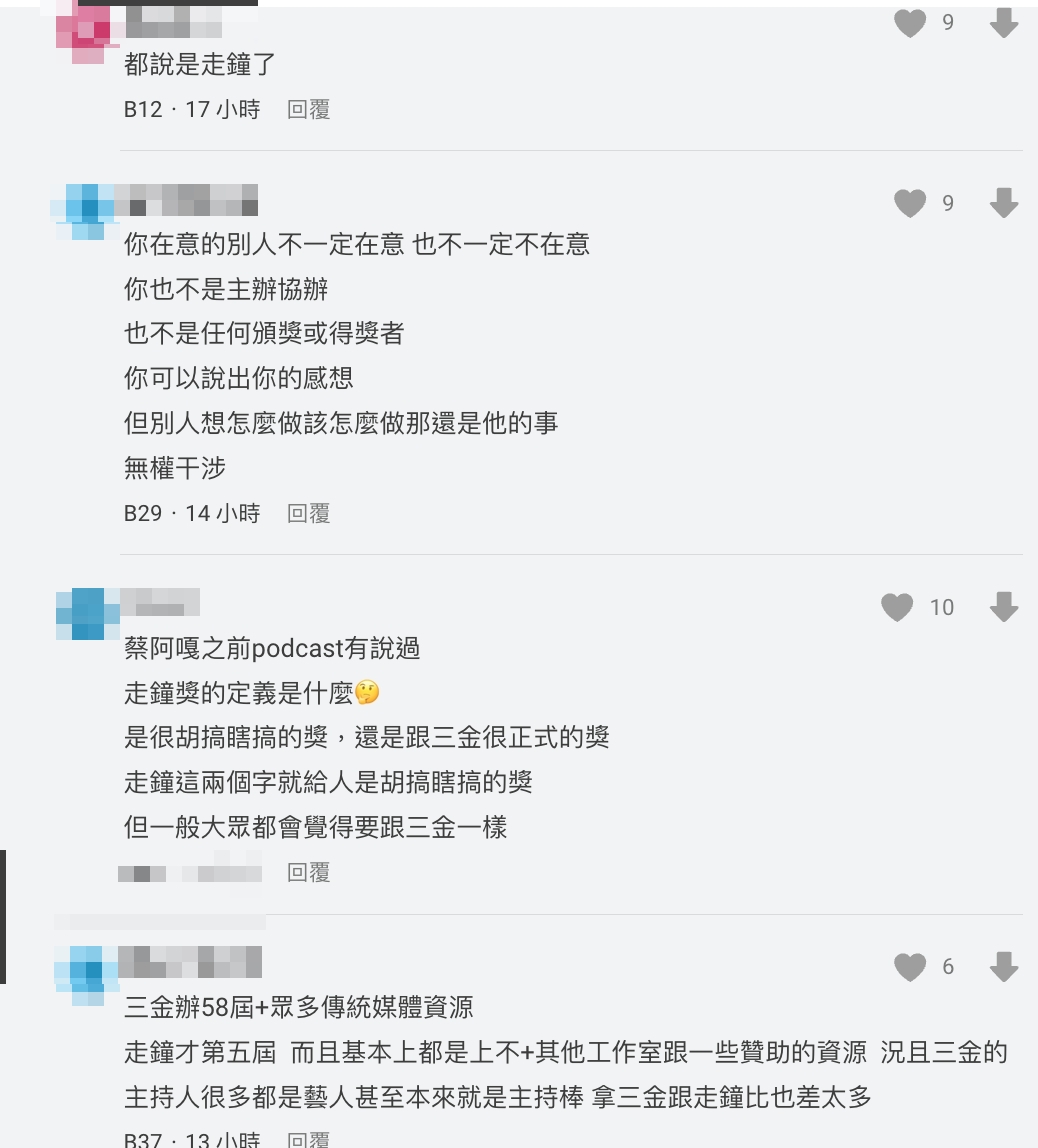 貼文曝光後,獲得許多網友的迴響,大家紛紛表示:「感覺創作者自己也沒有很重視這個頒獎典禮。」、「不認識也要自己想辦法去認識,這是工作,不是上自己頻道閒聊。」也有網友指出三金典禮舉辦到現在已經將近60年,還有國家在背後推動,反觀走鐘獎才舉辦5年,不應該給予這麼高的期待,兩者無法直接比較。