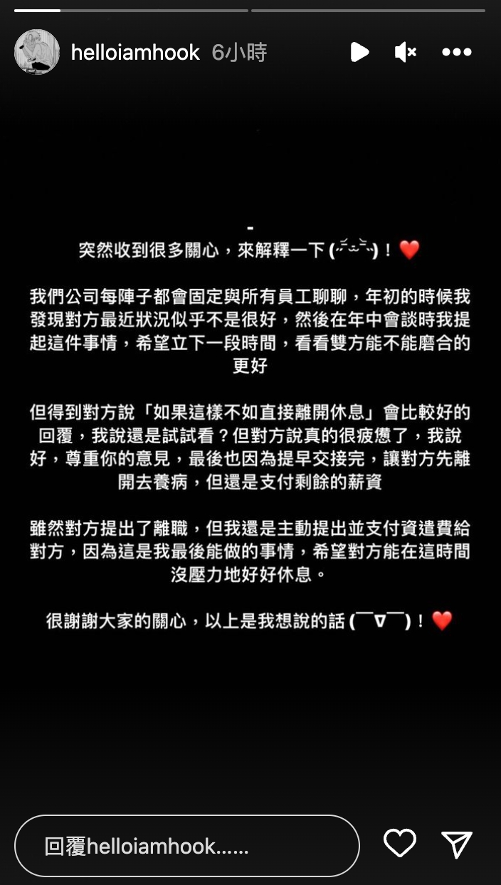 針對鬧不合一事,HOOKk 16日透過IG限時動態做出回應,她表示自己每隔一段時間就會跟員工們談話,年初的時候就發現對方的狀況不太好,「在年終會談時我提起這件事,希望立下一段時間,看看雙方能不能磨合得更好,但得到對方說:『如果這樣不如直接離開休息』會比較好的回覆。」最後因為提早交接完,就讓對方先去養病,還是會支付剩下的薪資。
