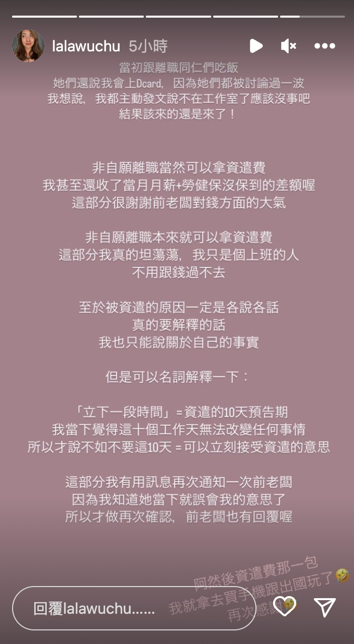 對此,拉拉認為自己是非自願離職,理應得到資遣費,但還是謝謝HOOK在錢的方面很大器,付給她當月薪水跟勞健保差額。至於被資遣的原因,她解釋HOOK所說的「立下一段時間」是資遣的10天預告期,「我當下覺得這十個工作天無法改變任何事情,所以才說不如不要這10天=可以立刻接受資遣的意思。」這部分有用訊息再次跟HOOK溝通。