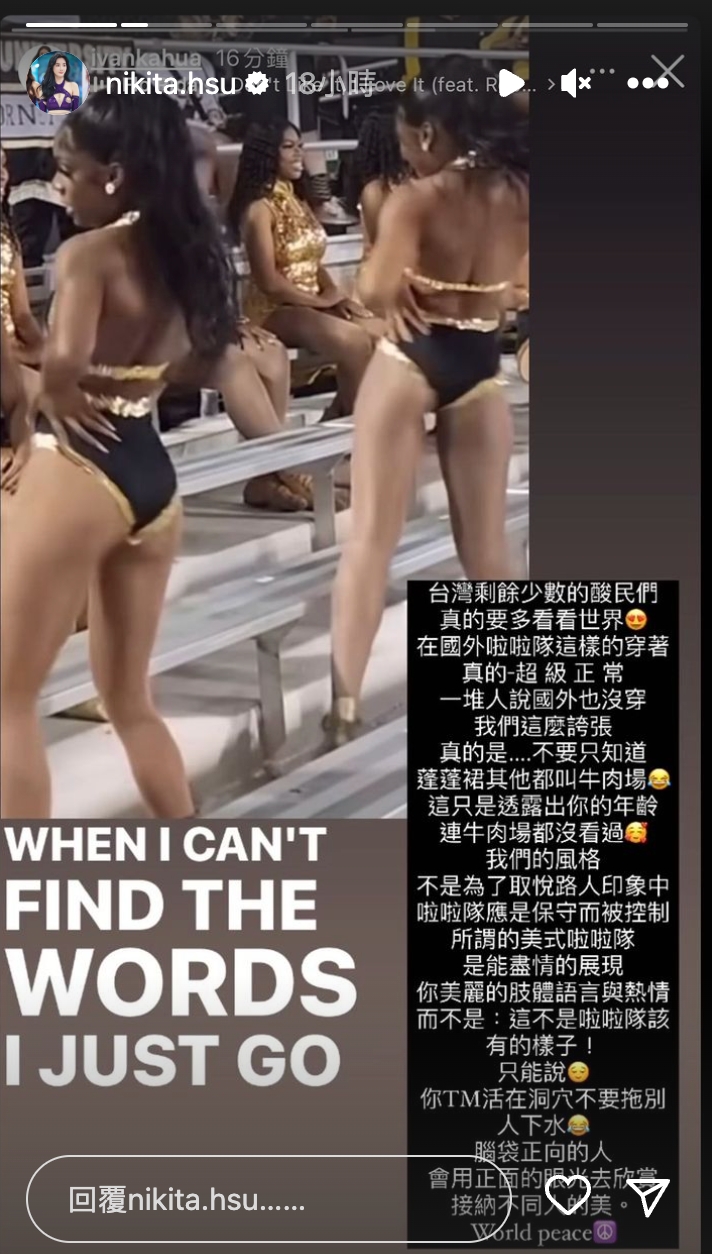 舒子晨諷刺地說:「不要只知道蓬蓬裙,其他都叫牛肉場。」他解釋LuxyGirls的風格不是為了取悅路人,也不應該被保守的觀念而束縛,「所謂的美式啦啦隊是能盡情的展現,你美麗的肢體語言與熱情,而不是『這不是啦啦隊該有的樣子!』」她最後更忍不住飆髒話怒嗆:「你TM活在洞穴不要拖別人下水,腦袋正向的人會用正向的眼光去欣賞,接納不同人的美。」