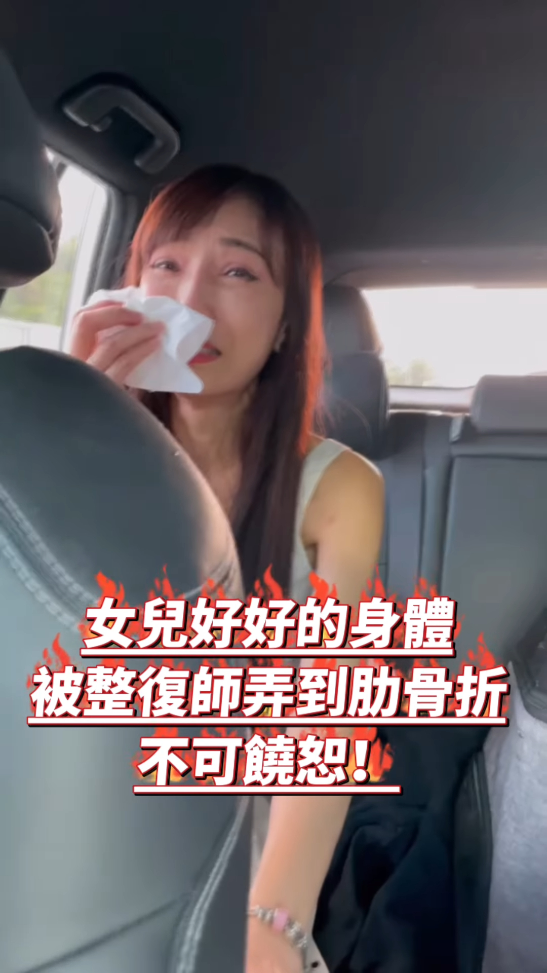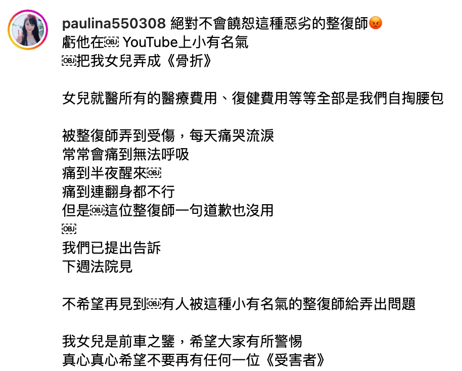 胡文英18日在IG表示:「絕對不會饒恕這種惡劣的整復師!虧他在YouTube上小有名氣,把我女兒弄成『骨折』。」她透露鄭靚歆被弄到受傷之後,常常痛到半夜醒來、無法呼吸,甚至連翻身都不行,每天以淚洗面,所有的醫藥費、復健費都是自掏腰包,但是整復師卻一句道歉都沒有。