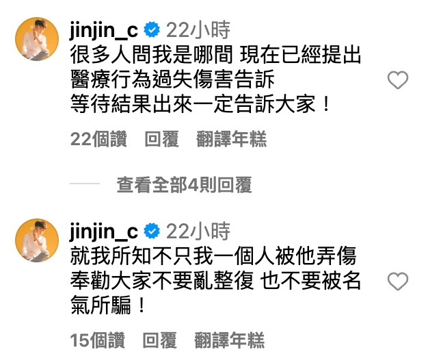 胡文英表示已經提出告訴,「不希望再見到有人被這種小有名氣的整復師給弄出問題。我女兒是前車之鑒,希望大家有所警惕,真心、真心希望不要再有任何一位『受害者』。」鄭靚歆也在留言區表示:「就我所知,不只我一個人被他弄傷,奉勸大家不要亂整復,也不要被名氣所騙!」也透露已經提出醫療行為過失傷害告訴,等待結果出來之後,就會告訴大家是哪一間。