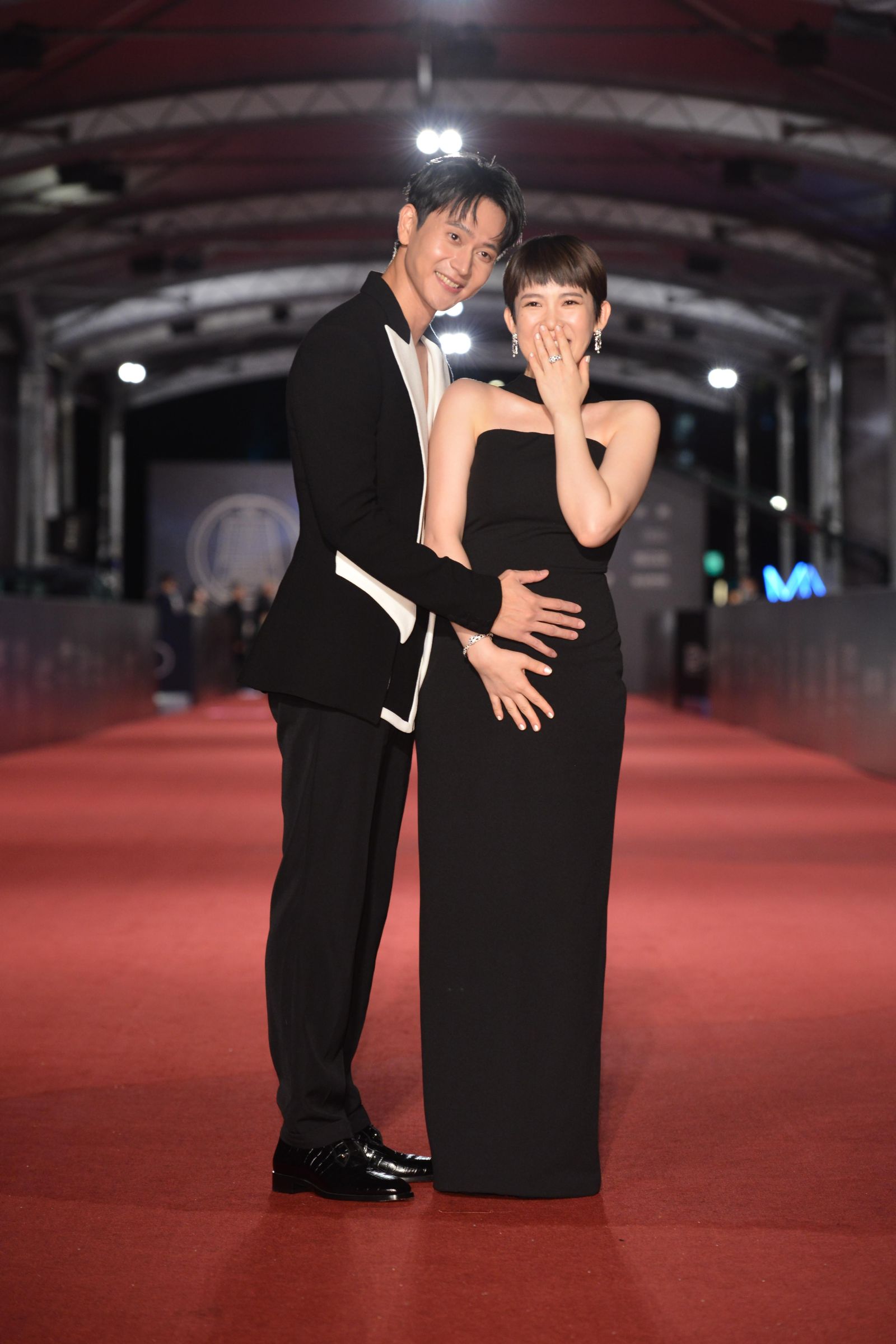 即將成為新手爸媽的劉冠廷跟孫可芳十指緊扣走上紅毯,只見兩人都身穿黑色成套禮服,頗有情侶裝的感覺,劉冠廷上身以黑色西裝搭配上白色布料,穩重中又帶點俏皮的感覺,相當有畫龍點睛的感覺;孫可芳則是身穿素面的黑色禮服,露出孕肚,看起來氣色相當好!