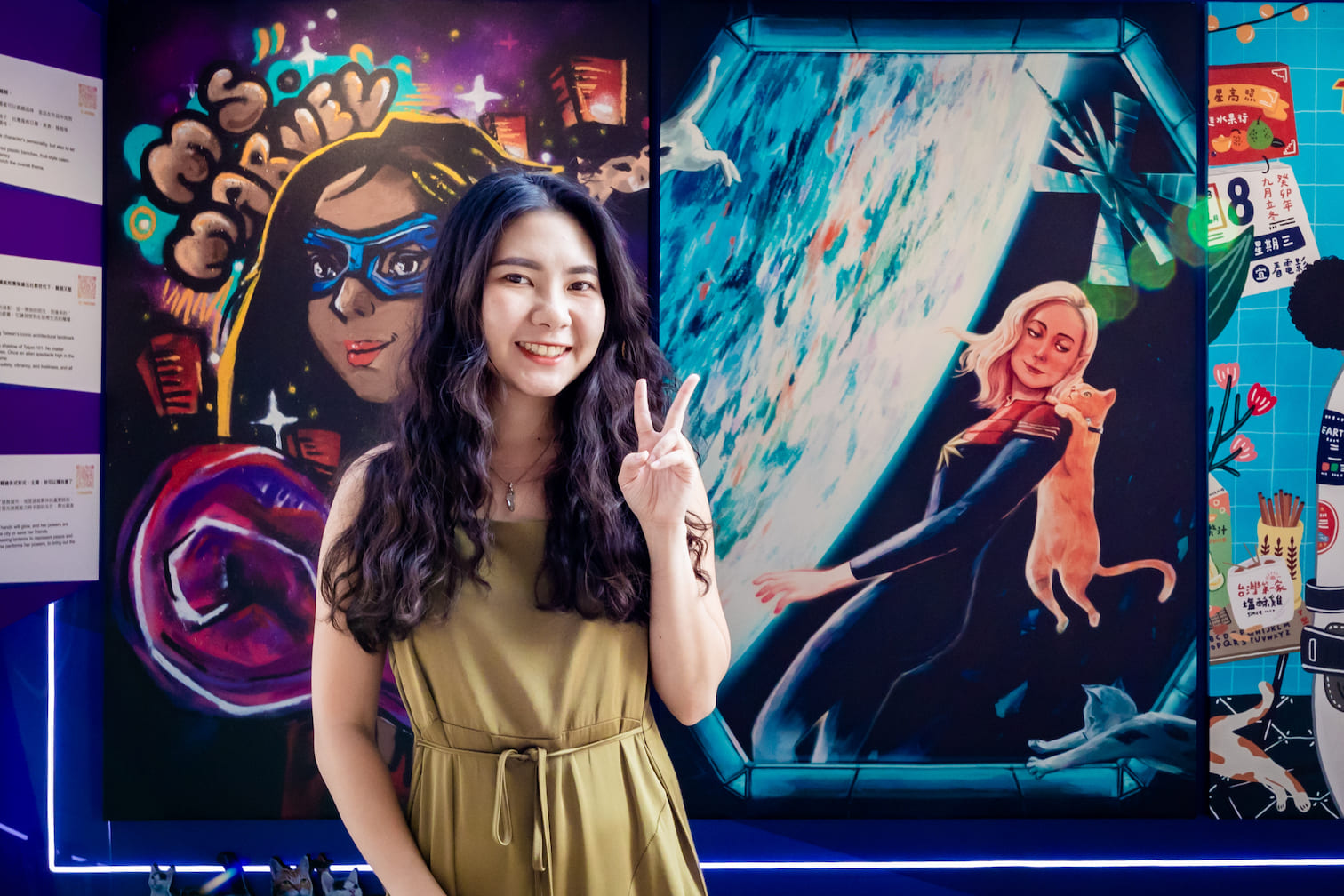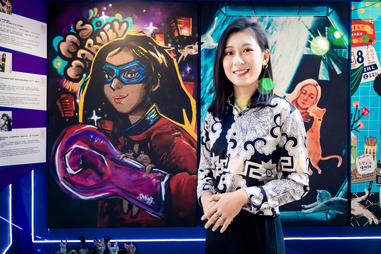 擅長細膩人像畫的插畫家盈青,她選擇帶觀眾從太空艙窗戶中看到驚奇隊長卡蘿丹佛斯與外星貓一起飛翔在浩瀚宇宙間,並且把台灣最具代表性的建築物之一的 101 大樓變成太空站,十分有趣相當令人玩味!對於能夠與合作,讓原不是本科出生的盈青但始終在繪畫創作的路上堅持著,她感性的說:「因為藝術是我的超能力,讓我的心更開闊、更柔軟卻也更堅強,從某種層面來說,藝術讓我成為了驚奇隊長!」
