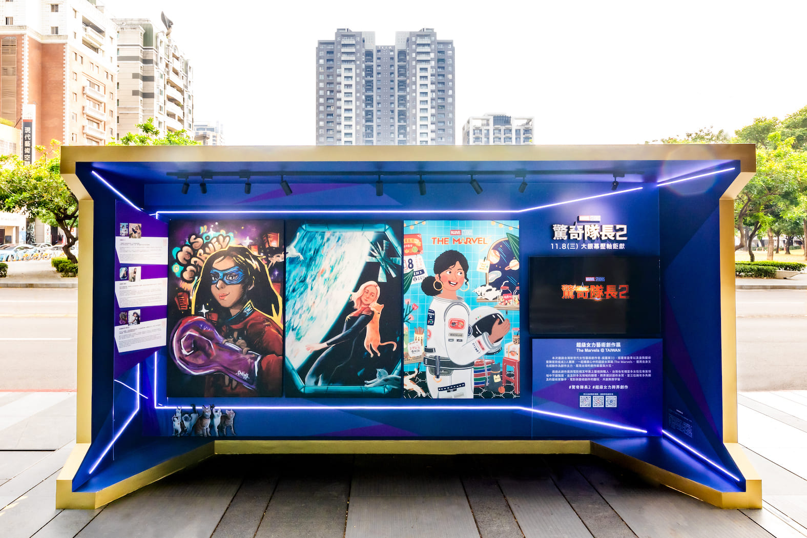 這次創作展更有令人眼睛為之一亮的彩蛋!三幅作品裡都有超萌外星橘貓呆頭鵝及貓咪大軍佛萊肯的身影在其中,還有兩隻貓咪穿越在作品之間,就代表在這次電影中,三位英雄在各自的宇宙裡,卻在受到蟲洞異常的關係互相產生交集到對方的宇宙,精心與電影呼應!而透過《驚奇隊長2》超級女力藝術創作展-The Marvels @TAIWAN ,翻玩電影藝術與職人領域,並且有更多對多元領域的關懷,跨界探討創作本質,台灣也有相當多女性在專業的領域中不讓鬚眉,當三位擁有多角觸及的創作藝術家聯手一起構築心中的超級女英雄-The Marvels,共創無限宇宙!本創作展從即日起展至 11 月 12 日,歡迎民眾前往台中勤美綠園道參觀、拍照打卡。