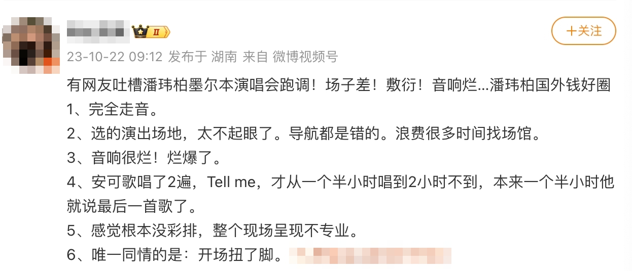 潘瑋柏日前在墨爾本舉辦演唱會,沒想到演出結束後,有網友在微博分享了一段表演片段,並指出他完全走音;演出場地不起眼,就連導航都找不到,害觀眾浪費很多時間在找路;現場的音響很爛;安可曲唱了兩遍才把演出時間延長到近2個小時。網友還直言:「感覺根本沒彩排,整個現場呈現不專業。」為一值得同情的還是潘瑋柏在開場時扭傷腳。(原影片點這)