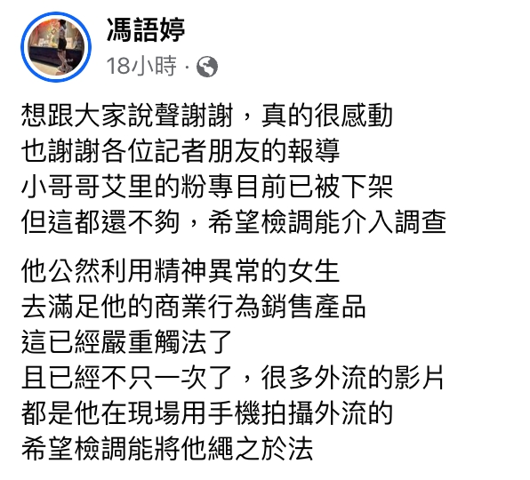 事情延燒3天後,小哥哥艾理的臉書粉絲專頁已經遭到下架,馮語婷更爆料:「且已經不只一次了,很多外流的影片都是他在現場用手機拍攝外流的,希望檢調能將他繩之於法。」不僅如此,她還發現艾里悄悄地開設了新的專頁,她特地將頁面公開,並呼籲大家持續去檢舉。
