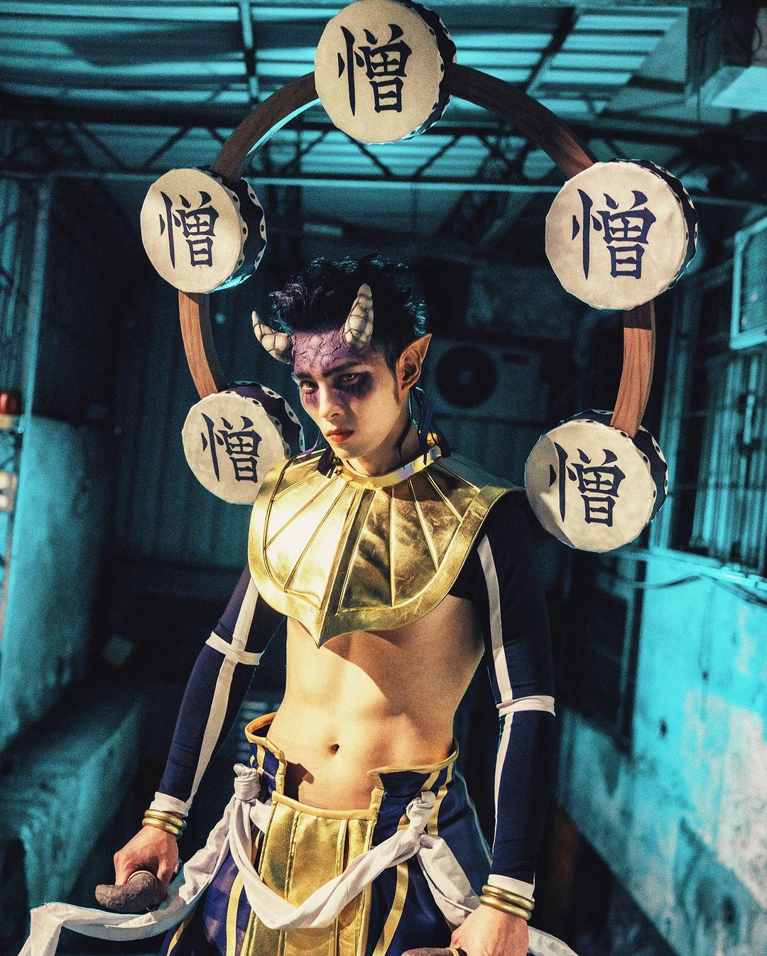 只見黃偉晉扮成《鬼滅之刃》的「半天狗-憎珀天」,只見他換上高仿真的角色衣服,由於衣服比較短的關係,使得胸肌跟腹肌全都一覽無遺,好身材全被看光光!不僅如此,由於原始角色背部有一個懸空的鼓,在操作上相當困難,他為此費盡苦心,所幸最後有成功還原。不僅服裝還原,黃偉晉就連妝容都很講究,包括臉上的紫色青筋跟角都如實呈現,相當厲害。