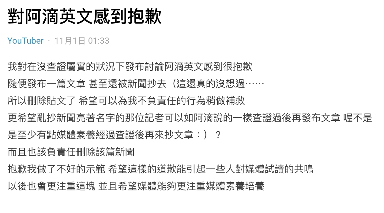 對於阿滴的解釋,原PO事後將文章刪除並道歉,「抱歉我做了不好的示範,希望這樣的道歉能引起一些人對媒體試讀的共鳴。」阿滴也暖心地表示:「雖然內文有些錯誤資訊,但原文章看得出來你只是想提出討論。」也謝謝原PO願意刪文以及發道歉文。