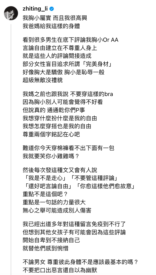 李芷婷表示:「我胸小屬實,而且我很高興。」看到留言區有很多男生在評論自己的胸部大小,但她認為言論自由不該建立在不尊重人身上,「就是這些人的評論間接造成部分女性盲目追求所謂『完美身材』,好像胸大是驕傲,胸小是恥辱一般,超級無敵沒禮貌!」坦言媽媽也勸說過不要穿這種比基尼,因為胸部小,別人會覺得不好看,她則直言:「通通乾你們P事!我想穿什麼、扮什麼是我的自由,我想怎麼穿搭也是我的自由,尊重兩個字銘記在心吧。」