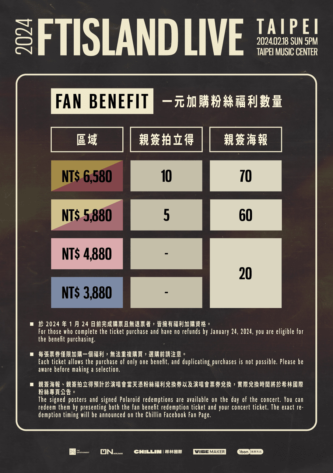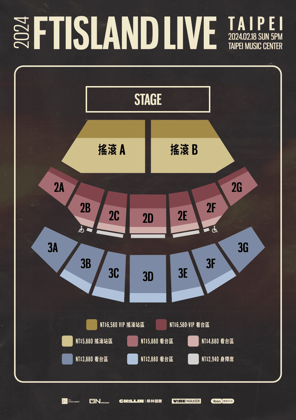 韓國首席美男樂團 FTISLAND 即將在2024年2月18日臺北流行音樂中心舉辦「2024 FTISLAND LIVE ‘HEY DAY’ IN TAIPEI」演唱會,演唱會活動門票將於 2023年11月11日(六)中午 12 點在 ibon 售票網站及全臺 7-11 ibon 機台開賣,演唱會票價為 NT$5,880 / NT$4,880 / NT$3,880 / NT$2,880,另推出限量 VIP 套票 NT$6,580 (含價值 NT$5,880 票券乙張、搖滾區優先入場資格、彩排福利券乙張、VIP 專屬工作證套乙組),