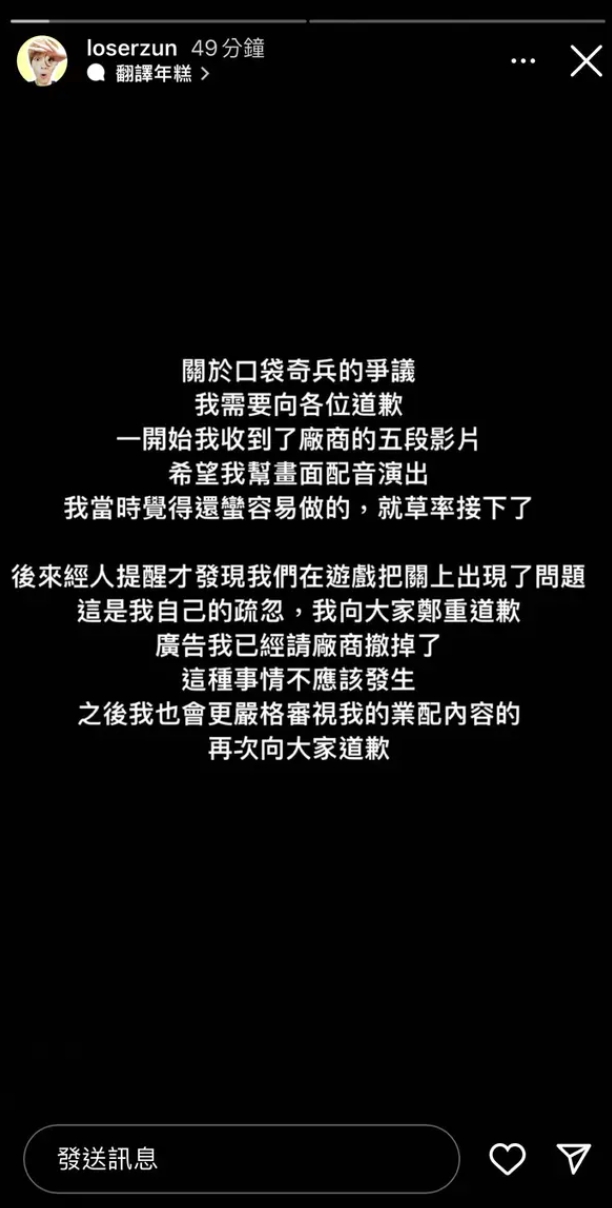 手遊「口袋奇兵」最近找來許多網紅合作拍攝業配廣告,其中還包含放火跟尊,不過YouTuber賴鴻麟踢爆他們都是「做假」,因為實際的遊戲畫面跟廣告不一樣,認為他們只是照稿唸,沒有實際玩過。對此,尊立刻出面道歉並坦言:「我當時覺得蠻還蠻容易做的,就草率接下了。」