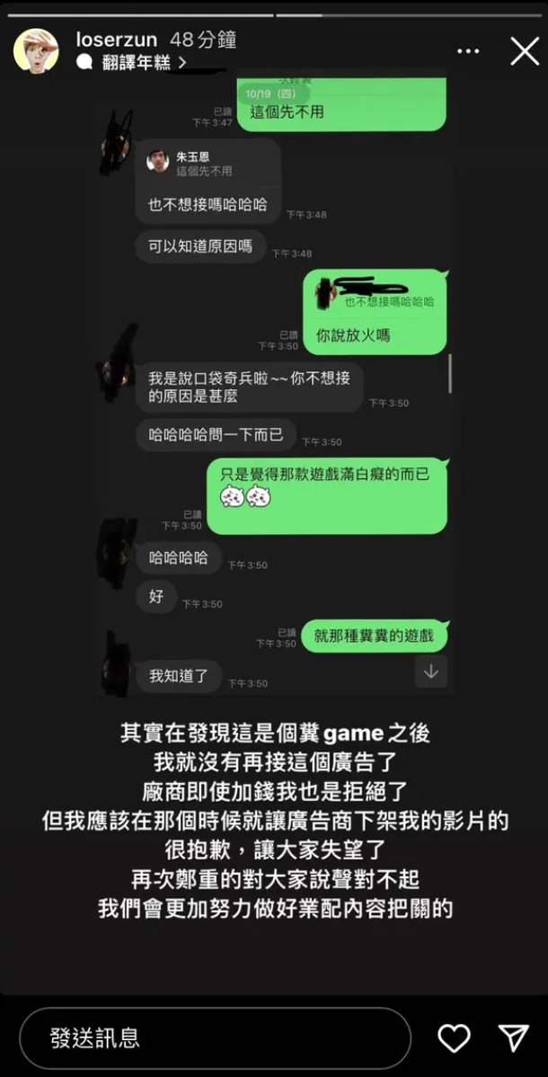 不僅如此,尊還曬出10月19日和其他人的對話紀錄,只見他當時就發現遊戲有問題,他表示:「其實在發現這是個冀game之後,我就沒有再接這個廣告了,廠商即使加錢我也是拒絕了。」後悔沒有第一時間就請業主將廣告下架,對於自己的行為感到很抱歉。