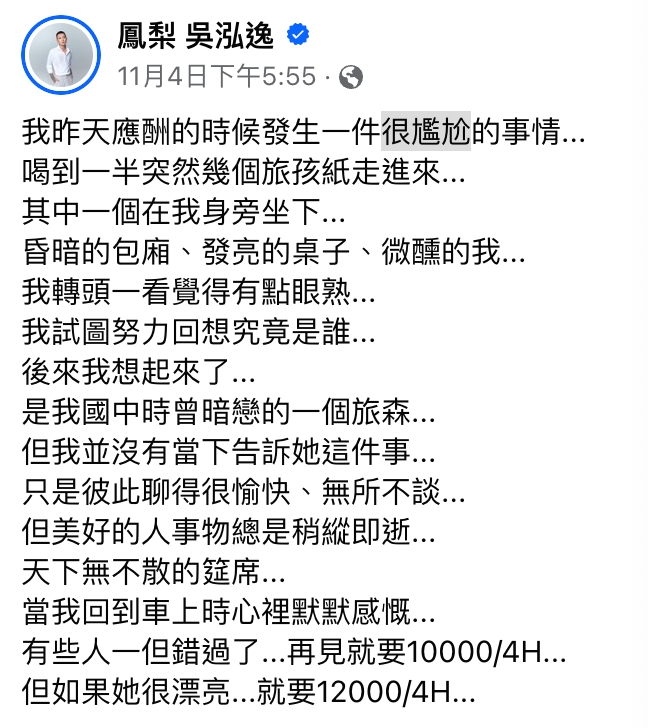 網紅鳳梨(吳泓逸)接地氣的個性深受網友的喜愛,他也經常與網友分享生活,像是日前去應酬時,突然來了幾位女生,其中一位竟然是國中暗戀過的女同學,只不過他無奈表示:「有些人一但錯過了,再見就要10000/4H...」網友一看全秒懂。