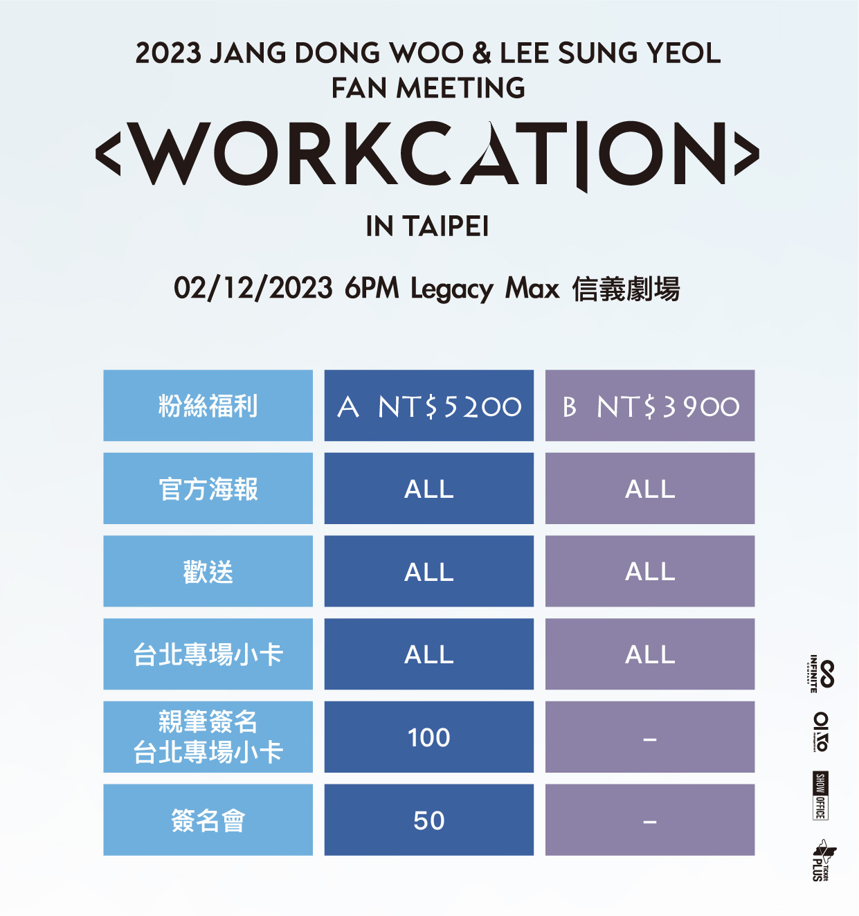 INFINITE日前在台北成功舉辦完兩場演唱會,獲得滿滿粉絲支持當下,成員也感性致謝並相約,希望能用最快時間再次跟大家相聚,而其中成員東雨與成烈果然信守承諾,確定於12/2(六)晚間六點,在「信義劇場Legacy MAX」舉辦「2023 JANG DONG WOO & LEE SUNG YEOL FAN MEETING <WORKCATION> IN TAIPEI」,送給所有INSPIRIT在2023年底前最後壓軸的大驚喜!
