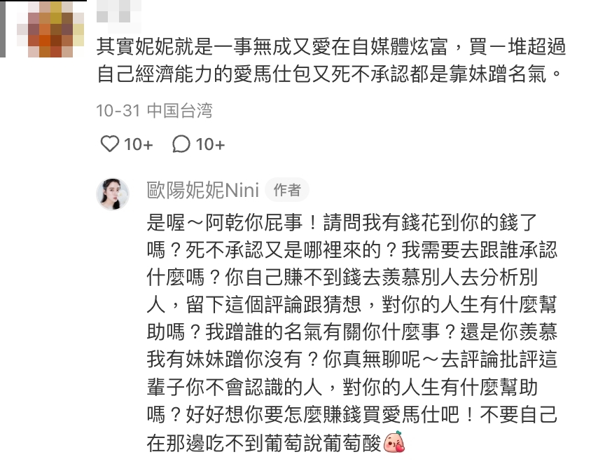 歐陽妮妮日前開箱歐陽娜娜的聯名鞋,卻引來網友在留言區嗆:「其實妮妮就是一事無成又愛在自媒體炫富,買一堆超過自己經濟能力的愛馬仕包,又死不承認都是靠妹蹭名氣。」對此,歐陽妮妮火大回擊:「是喔~阿是乾你屁事!請問我有錢花到你的錢了嗎?死不承認又是哪裡來的?我需要去跟誰承認什麼嗎?」