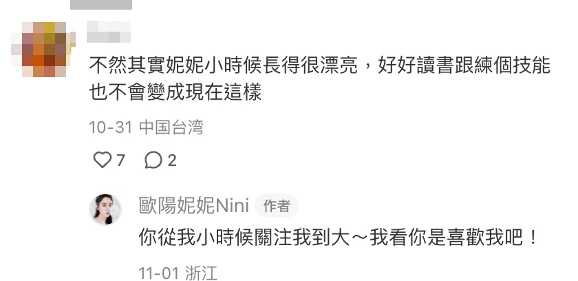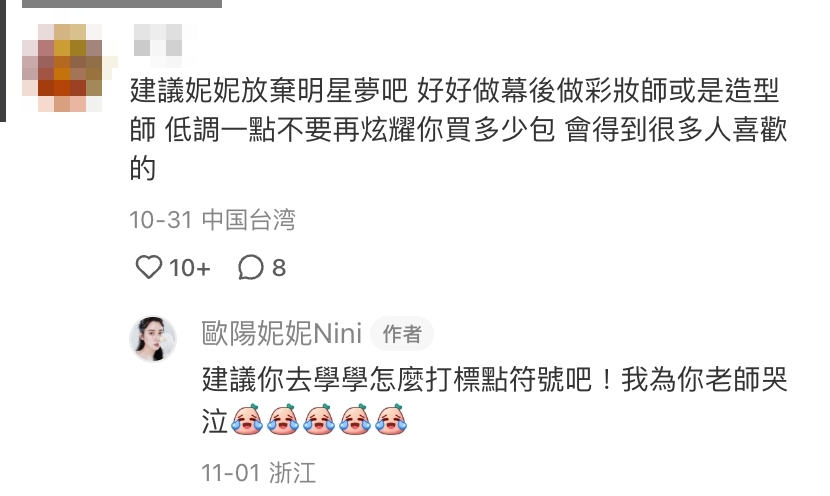 不僅如此,網友還表示:「建議妮妮放棄明星夢吧!好好做幕後、做彩妝師或是造型師,低調一點不要再炫耀你買多少包,會得到很多人喜歡的」、「其實妮妮小時候長得很漂亮,好好讀書跟練個技能也不會變成現在這樣」,總共留下了三則留言。而歐陽妮妮也一一回覆「建議你去學學怎麼打標點符號吧!我為你老師哭泣」、「你從我小時候關注我到大~我看你是喜歡我吧」。