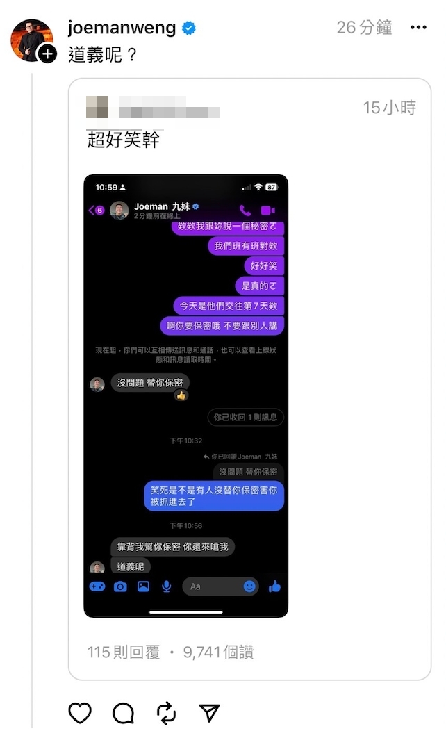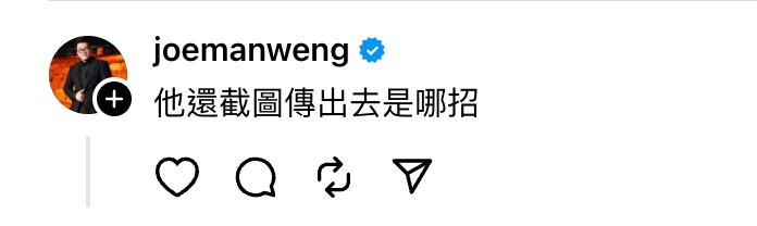 對此,Joeman本人在留言區表示:「他還截圖傳出去是哪招?」還親自將貼文轉發到IG上並再次表示:「道義呢?」對此,網友紛紛表示:「走在話題尖端的男人」、「笑死~可不可以不要那麼皮啊」、「我直接被九妹圈粉」,就連阿滴都現身留言區回覆3個笑哭的表情。