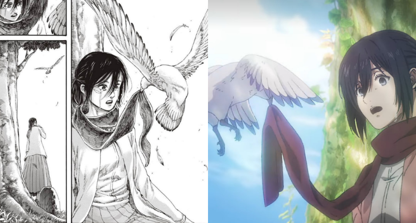 在原先的《進擊的巨人》漫畫中,故事的最後米卡莎坐在艾連小時候最喜歡的樹下乘涼,每當他回想起艾連還是都會留下難過的眼淚,沒想到此時有隻海鷗海鷗飛來稻米卡莎的面前,並且替她圍上圍巾與她道別,故事就在這畫上休止符。