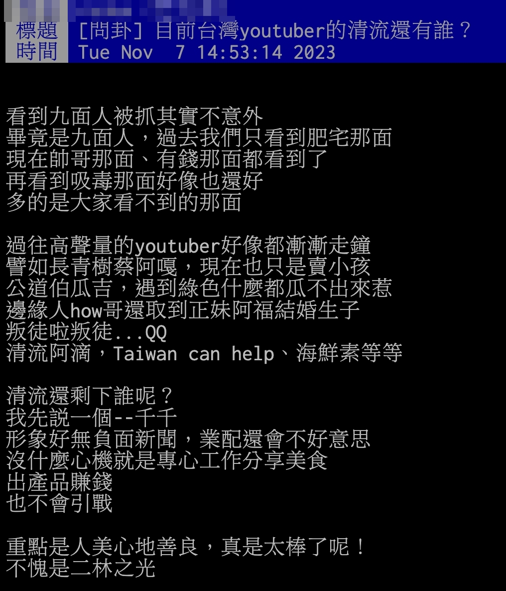 究竟誰是目前僅存的清流,原PO認為是「千千」,指出她形象好、沒有負面新聞、業配還會不好意思,更大讚:「沒什麼心機,就是專心工作、分享美食,出產品賺錢也不會引戰,重點是人美心地善良,真是太棒了呢!」