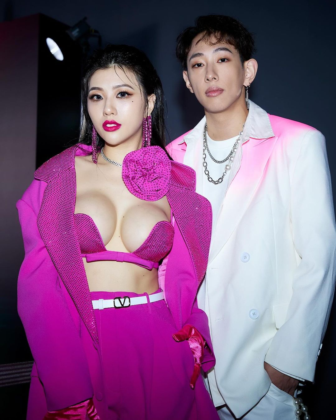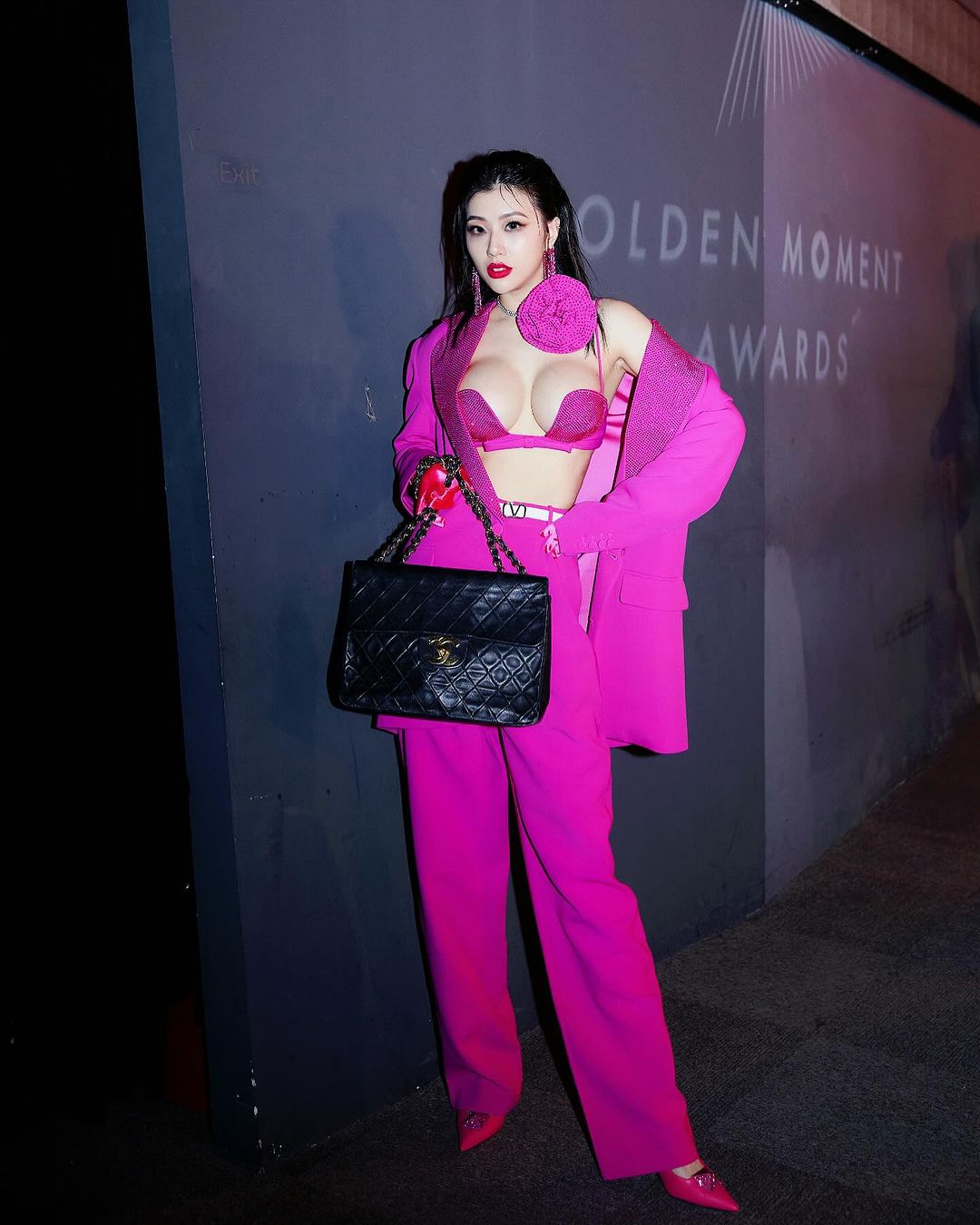 不過最吸睛的是強尼當天的穿著,只見她身穿桃紅色套裝,光是超鮮豔的顏色就讓她足夠成為全場焦點。令人害羞的是,強尼的上衣僅用兩片超小的布料遮點,大方露出豐滿的上圍,胸前還配有一朵花,即使再穿了一件西裝外套,也讓人的視線焦點很難不緊盯胸口。照片曝光後,火辣穿著讓網友都大讚:「全場最辣代表」、「這服裝太強」、「這服裝太兇猛」,就連小A辣都表示:「好大啊!」