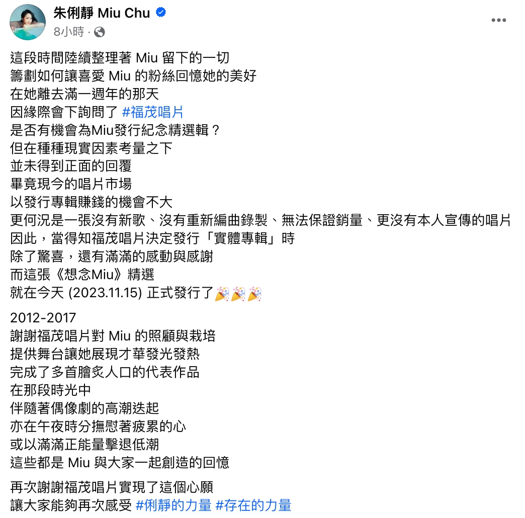 歌手朱俐靜2020年宣布罹患乳癌,怎料抗癌兩年後,因不敵病魔而在2022年離世,享年40歲。如今已經時隔1年多,她的臉書突然更新動態,並宣布1件好消息,粉絲見狀後感動表示:「永遠都想念Miu。」