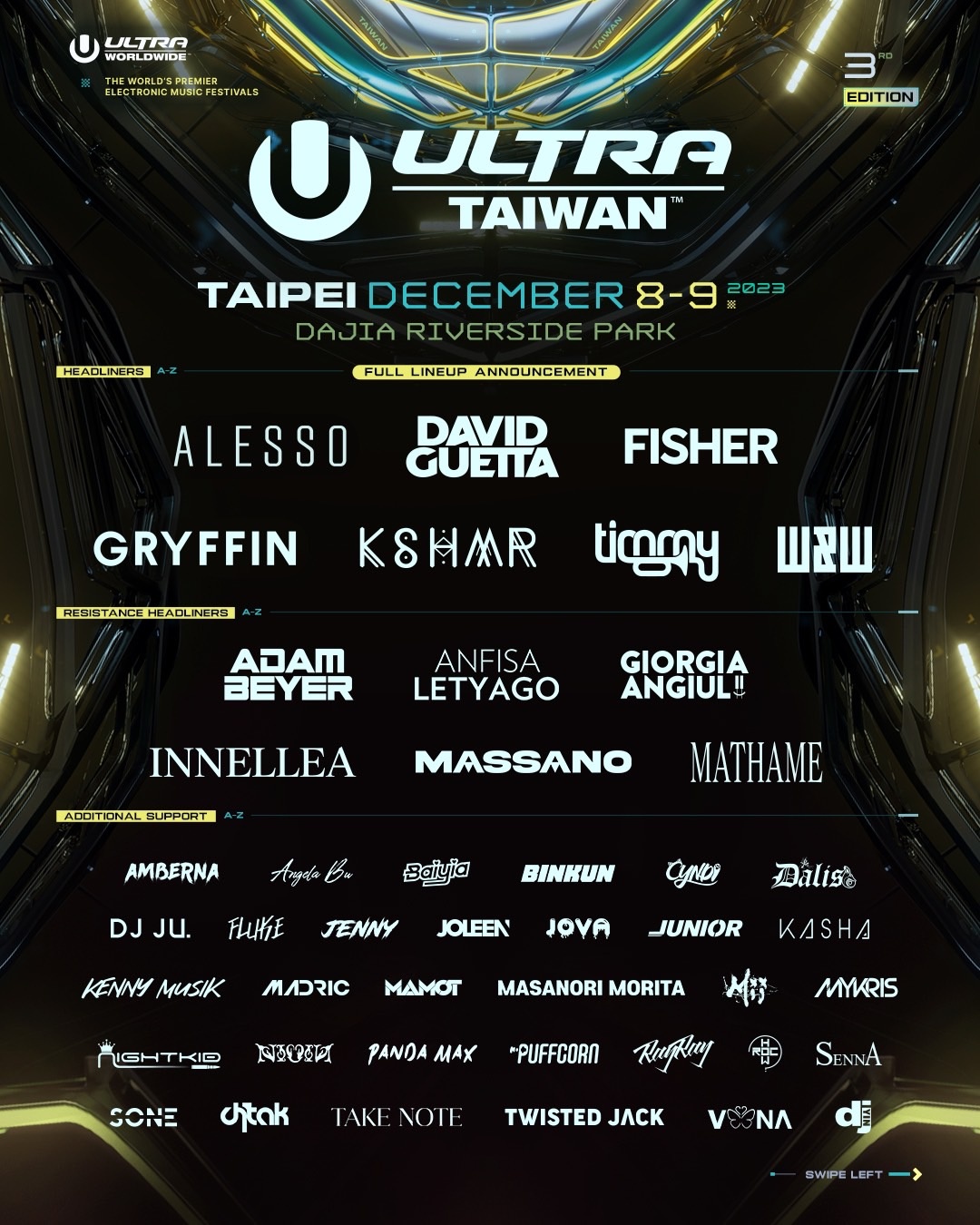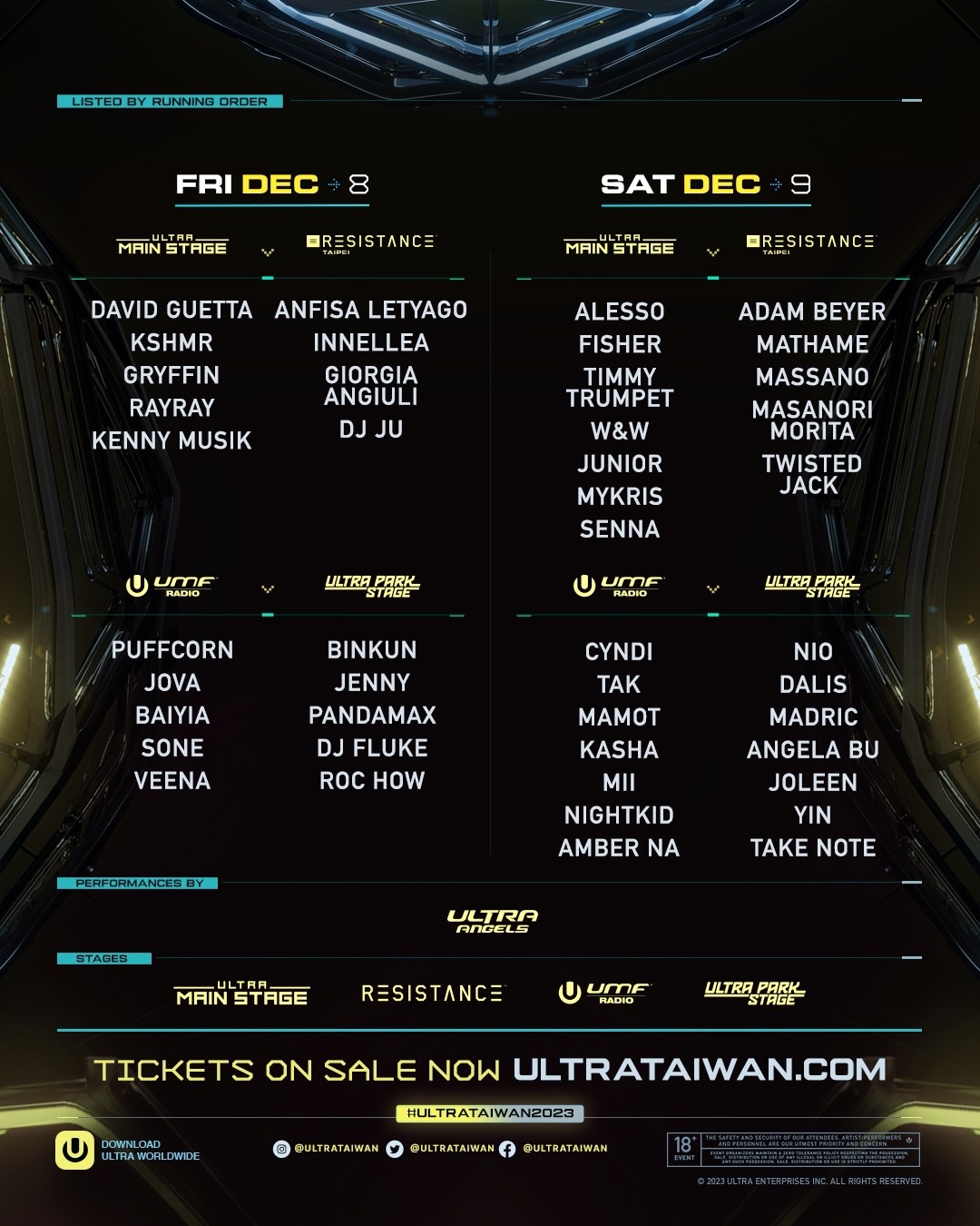 《DJ Mag》最新公布的「2023年世界百大DJ排行榜」當中,有7位世界百大DJ將在12月8日、9日來台參加第三屆Ultra Taiwan,「EDM教父」David Guetta(大衛庫塔)相隔一年再度重返冠軍,這也是他第三度拿下百大DJ冠軍,「全世界最會吹的DJ」Timmy Trumpet(提米小號)上升兩個名次登上第6名,持續穩居前10名,人氣不減,「印度電音鬼才」KSHMR名列第15名、「派對國歌製造機」W&W(王炸)名列第16名,而「Tech House 大神」Fisher(魚人)一次爬升28個名次登上第20名,首次進入百大前20名之列,也是前50名當中上升名次最多的人氣炸子雞,「瑞典電音王子」Alesso(艾利索)名列第52名,首度來台的「Techno傳奇王者」Adam Beyer則是名列第61名。