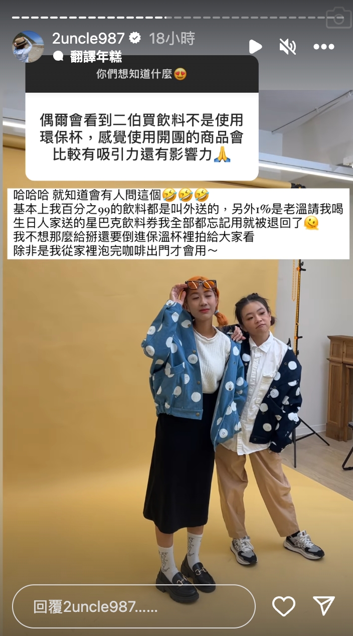 二伯16日在IG開問答與網友互動,有人表示:「偶爾會看到二伯買飲料不是使用環保杯,感覺使用開團的商品會比較有吸引力還有影響力。」對此,二伯直言早就知道會有人問這個問題,她解釋:「基本上我百分之99%的飲料都是叫外送的」,剩下1%是別人請客,就連別人送的星巴克飲料券都忘記使用而被退回,顯見平常很少買飲料。二伯也坦言:「我不想那麼給掰,還要倒進保溫杯裡拍給大家看。」除非是在家裡就泡好咖啡帶出門,否則沒有太大的機率能使用環保杯。